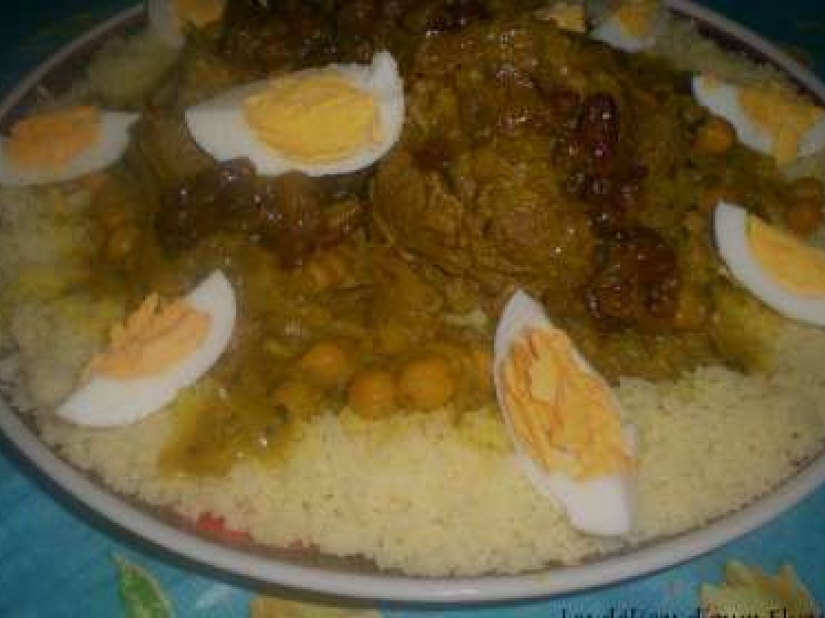 Couscous aux raisins secs et oignons caramélisés PlatDifficile1 h 30 m Envoyer cette recette à un ami Imprimer cette page Poser une question à l'auteur Publier votre photo de cette recette Ingrédients 4 1,5 kilos de collier d'agneau 1kg d'oignons émincés en lanières 200g de pois chiches trempés la veille huile d'olive sel poivre safran curcuma curry gingembre cannelle en poudre coriandre et persil hachés finement 1 kg de couscous fin 1 càs de beurre 200g de raisins secs 3 càs de sucre en poudre 3 oeufs durs pour la décoration