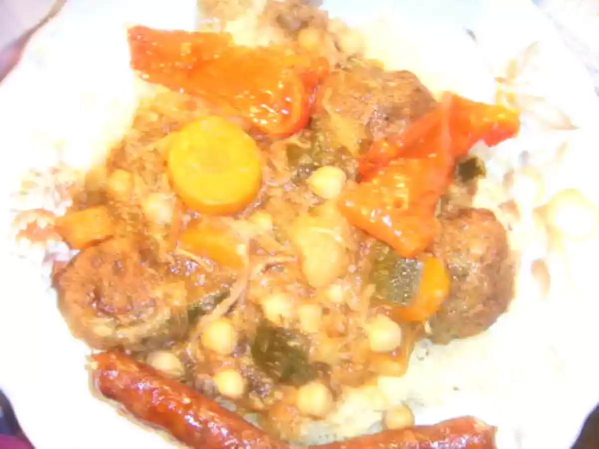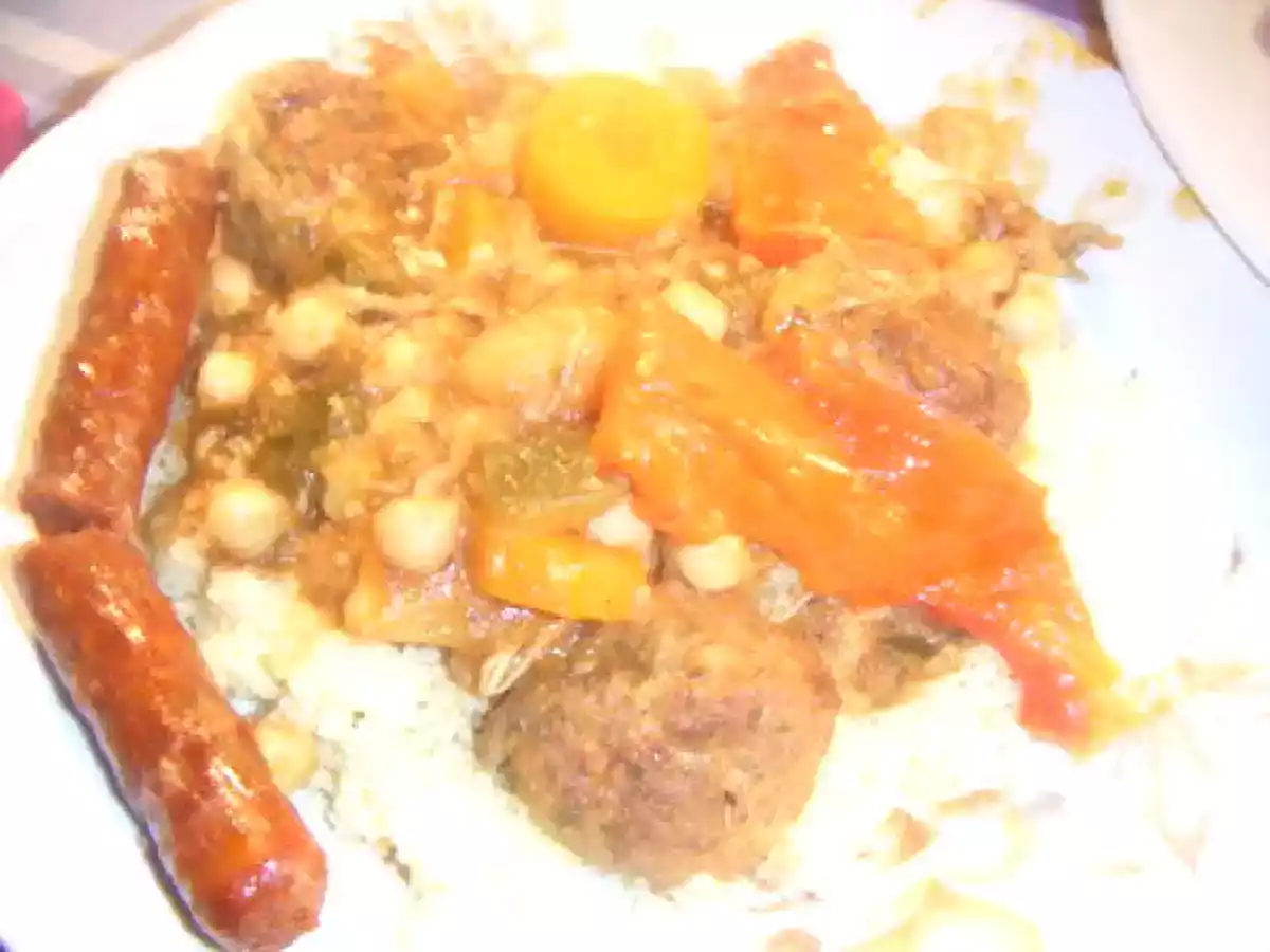 Couscous royal votez maintenant PrécédentSuivant Platfacile1 h 40 m Envoyer cette recette à un ami Imprimer cette page Poser une question à l'auteur Publier votre photo de cette recette Ingrédients 6 6 cuisses de poulets 6 blancs 6 merguez 6 boulettes de viande 1 oignon de l'ail 4 courgettes 3 carottes 2 navets 6 pommes de terre 4 tomates mûres 2 gros poivrons rouges 2 tasses de pois chiche précuits 1 petite boite de concentré de tomate 3 cuillères à soupe de beurre ou huile d'olive ras el hanout paprika sel poivre piment doux 1 kg de couscous