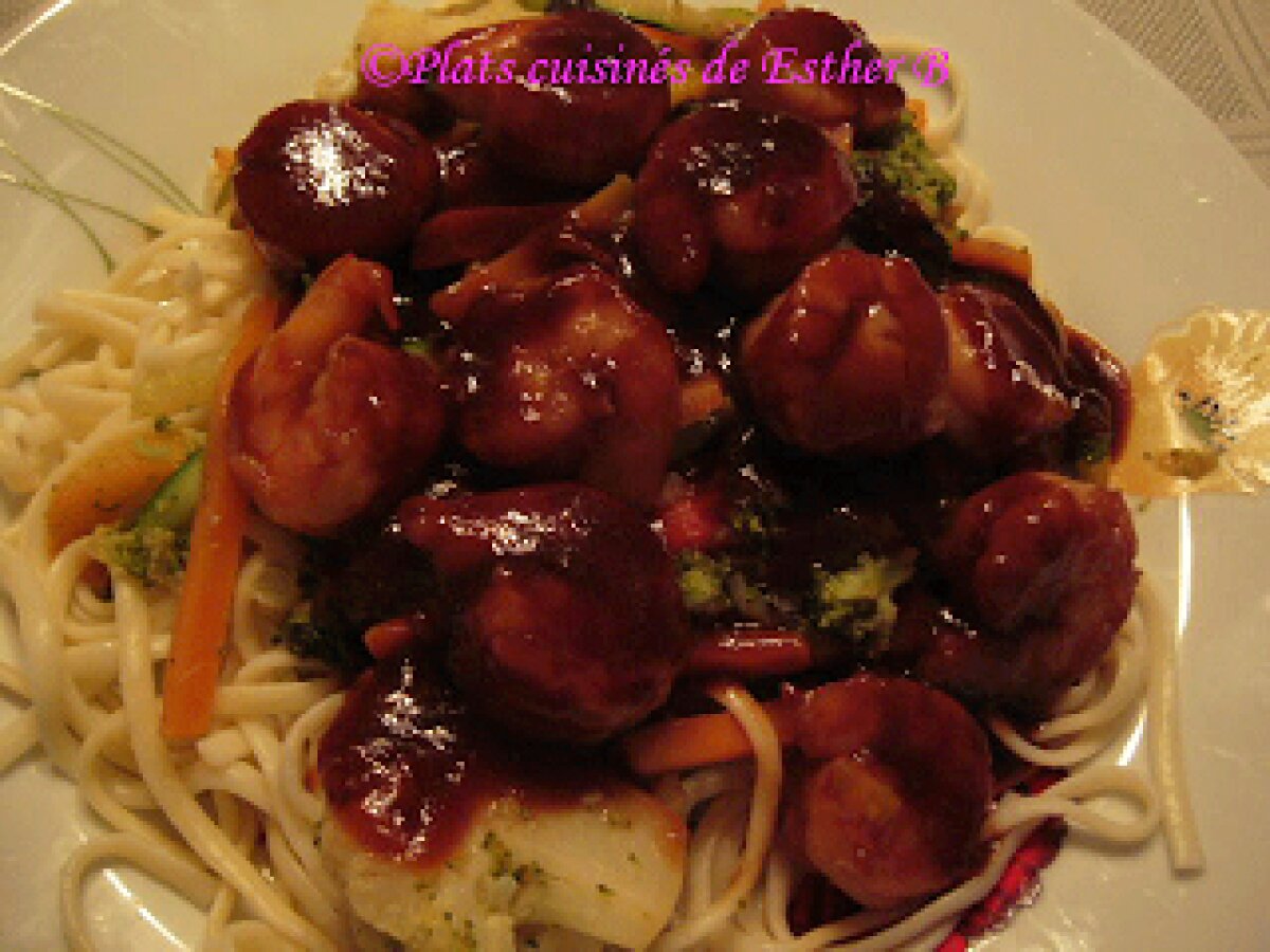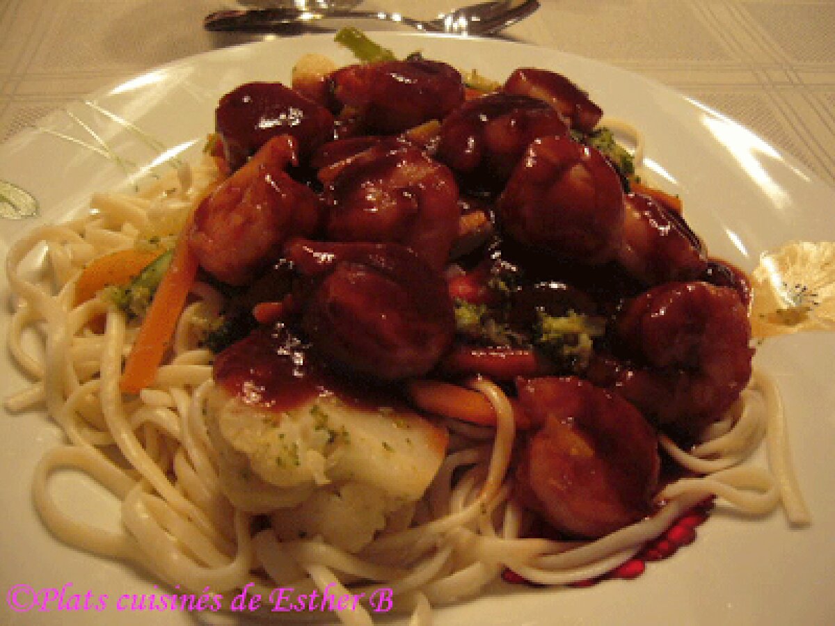 Un merveilleux plat de fruits de mer tout en saveur accompagné d'une sauce légèrement sucrée, servi sur un lit de linguine! C'est tout à fait exquis.