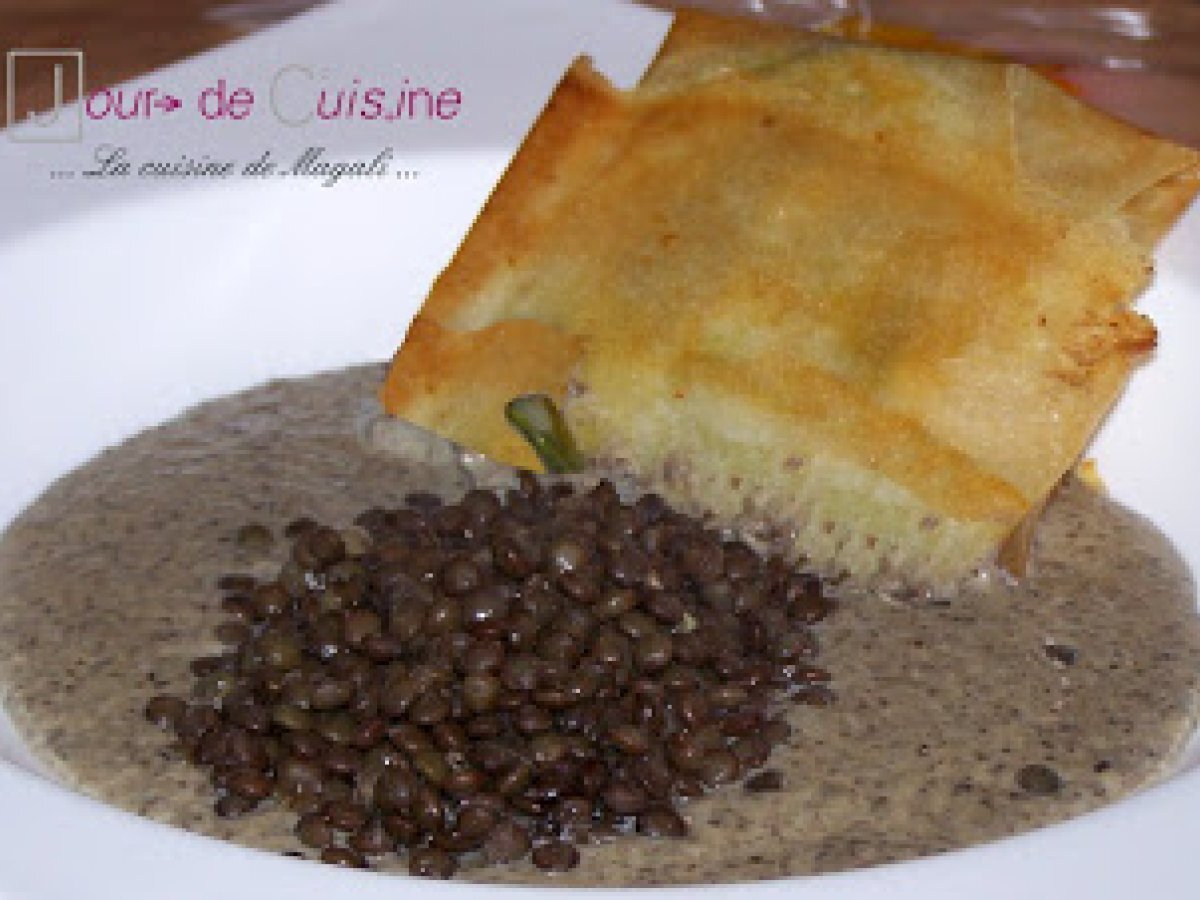 Croustillant de saumon aux lentilles votez maintenant Platfacile1 h 5 m Envoyer cette recette à un ami Imprimer cette page Poser une question à l'auteur Publier votre photo de cette recette Ingrédients 4 400 g de lentilles 4 feuilles de brick 600 g de saumon en filet 15 cl de crème liquide 4 poireaux nouveaux ou 1 blanc de poireau 1 oignon Sauce soja Sel, poivre, curry Thym, laurier Beurre fondu