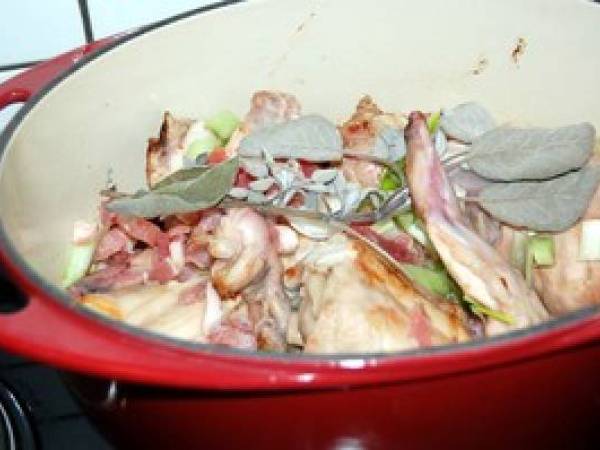 Un plat traditionnel de lapin délicieusement mijoté avec des petits lardons et des oignons nouveaux...Et bien, c'est très très bon !...surtout quand les morceaux de crumble se mélangent avec la sauce parfumée......de la pure gourmandise pour un plat salé et puis c'est tout !