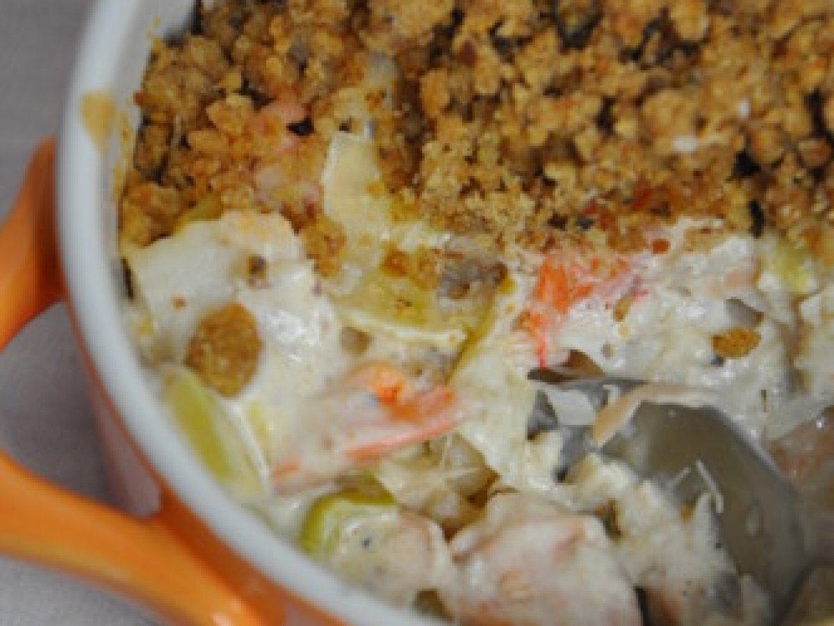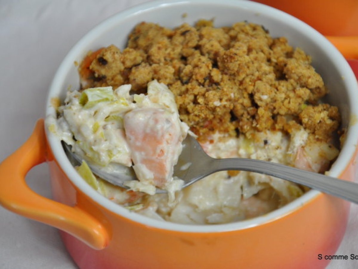 Crumble de poisson aux épices cajun PrécédentSuivant Platfacile35 min Envoyer cette recette à un ami Imprimer cette page Poser une question à l'auteur Publier votre photo de cette recette Ingrédients 4 150 g de saumon 150 g de queues de crevettes décortiquées 300 g de filet de cabillaud ou autre poisson blanc 1 poireau 40 g de farine complète 40 g de chapelure 1 cuillère à café bombée de mélange d'épices cajun 40 g + 30 g de beurre 20 cl de crème liquide sel, poivre