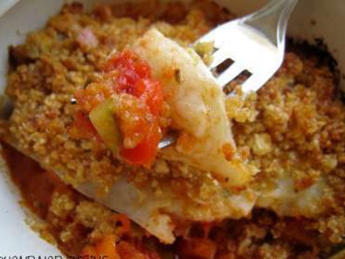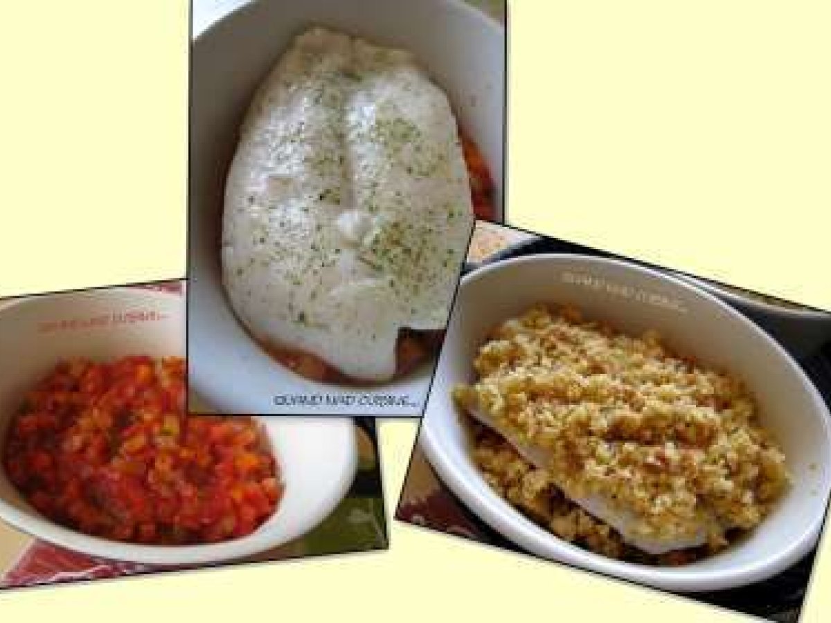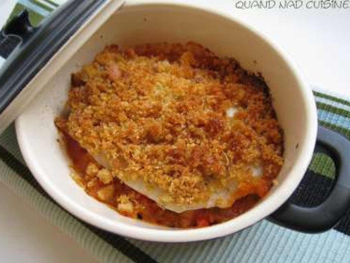 Voilà une autre façon de manger du poisson: sur un lit de légumes fondants et sous un crumble croustillant et parfumé, le tout présenté en petites cocottes individuelles: un délice!