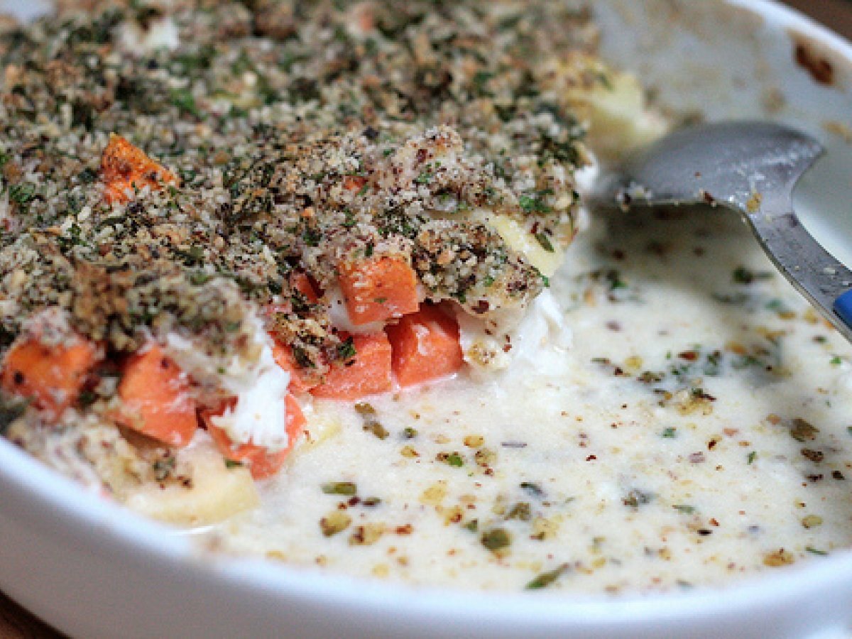 Crumble de poisson, pomme & carotte à la noisette