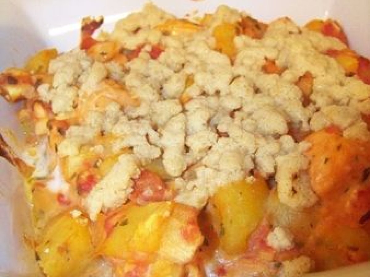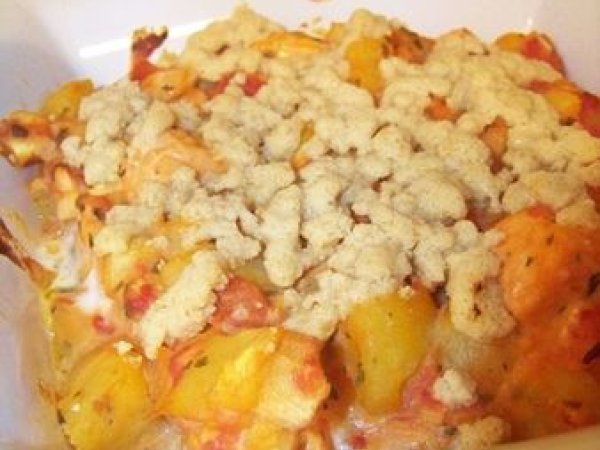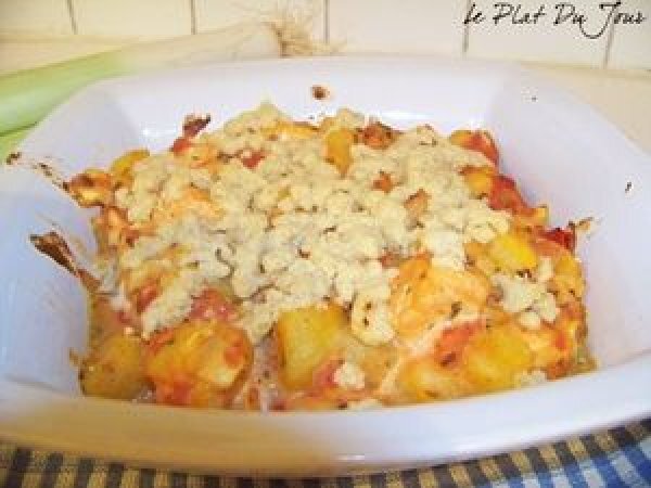 Crumble de saumon aux courgettes, poireaux et pommes de terre votez maintenant PrécédentSuivant Platfacile30 min921 Kcal Envoyer cette recette à un ami Imprimer cette page Poser une question à l'auteur Publier votre photo de cette recette Ingrédients 2 2 pavés de saumon 2 cuillères à café de fumet de poisson 1 courgette 1 poireau 2 pommes de terre 1 tomate 1 gousse d'ail 100 ml de crème liquide 60 g de beurre mou 50 g de farine 30 g de chapelure 1 cuillère à café d'huile persil
