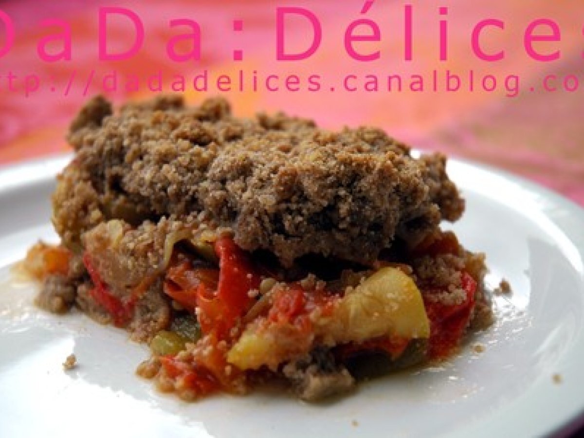Crumble salé de blé noir aux légumes Platfacile45 min Envoyer cette recette à un ami Imprimer cette page Poser une question à l'auteur Publier votre photo de cette recette Succulente!!! Ingrédients 6 LÉGUMES : 1 kg de tomates 2 belles aubergines une méga courgette du jardin ou 2 petites courgettes 1 poivron rouge et 1 poivron vert 4 échalotes 2 gousses d'ail huile d'olive Thym frais du balcon sel et poivre CRUMBLE : 150 g de farine de blé noir 120 g de beurre salé ramolli 100 g de parmesan