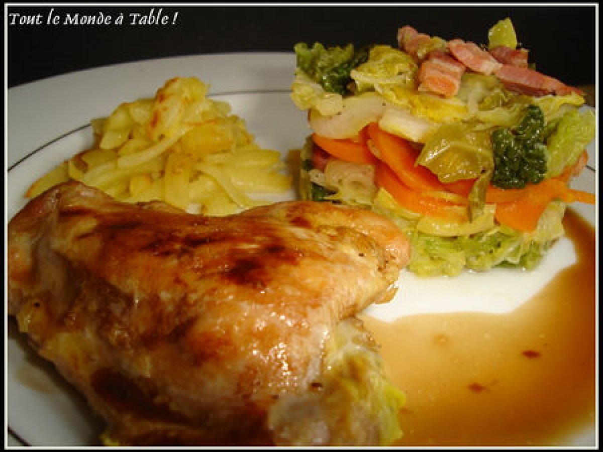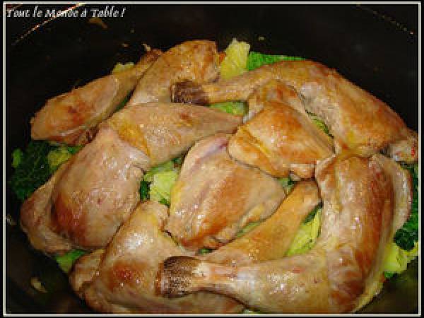 Cuisses de pintade au chou Platfacile1 h 15 m1726 Kcal Envoyer cette recette à un ami Imprimer cette page Poser une question à l'auteur Publier votre photo de cette recette Ingrédients 4 1 chou frisé 5 cuisses de pintade 5 carottes 1 oignon 2 gousses d?ail 150 g de lardons fumés 1 branche de thym 1 feuille de laurier sel poivre 25 cl de vin blanc d'Alsace 10 cl d'eau huile d'olive