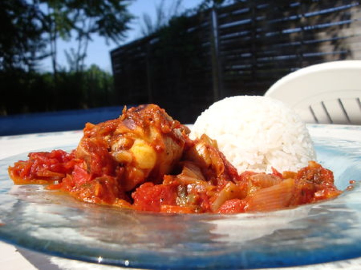 Cuisses de poulet à la sauce tomate pimentée et aux poireaux caramélisés
