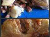 Ce plat se compose de cuisses de poulet dorées, mijotées dans une sauce onctueuse à base de vin blanc, crème fraîche, oignons, lardons fumés et champignons de Paris. La cuisson lente en cocotte permet aux saveurs de se mêler harmonieusement. La texture est riche et fondante, avec un équilibre parfait entre la douceur de la crème et la légère acidité du vin blanc, idéal à savourer avec des croquettes de pomme de terre.