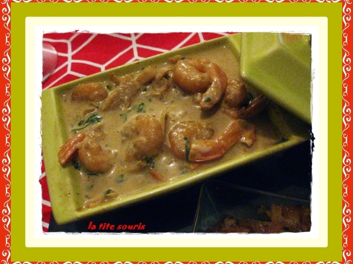 Curry de crevette au lait de coco et chou chinois sauté au soja PrécédentSuivant Platmoyen50 min Envoyer cette recette à un ami Imprimer cette page Poser une question à l'auteur Publier votre photo de cette recette Ingrédients 2 300 g de gambas surgelées et décortiquées, crues 2 c.c de curry 1 morceau de gingembre 1 bâton de citronelle 20 cl de lait de coco 10 cl de crème fleurette 1 c.s d'huile d'olive ciboulette et persil, sel et poivre noir