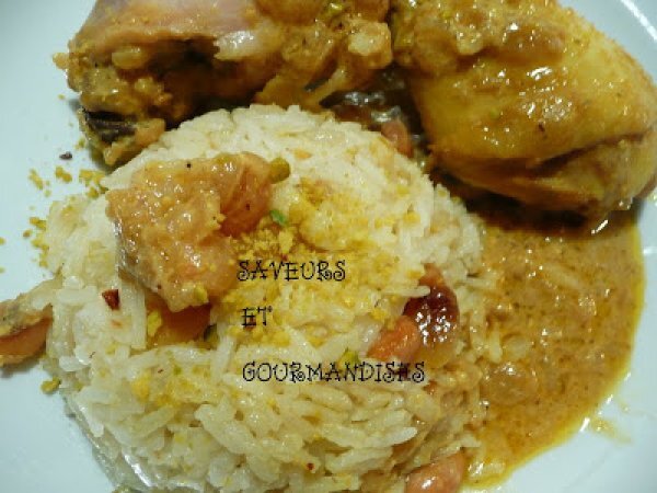Curry de poulet en cocotte et son riz aux fruits secs. PrécédentSuivant Platfacile57 min Envoyer cette recette à un ami Imprimer cette page Poser une question à l'auteur Publier votre photo de cette recette Ingrédients 4 4 cuisses de poulet 2 oignons 1 petit morceau de gingembre frais 2 gousses d'ail 1 cuillère à café rase de coriandre moulue 1 cuillère à café rase de cumin 1 pincée de piment séché 2 cuillère à café de poudre d'amandes 2 pots de yaourt nature 250ml de bouillon de poulet 1 cuillère à café de sucre 1 cuillère à soupe de curry 50 g de raisins secs blonds Du ghee Pour le Riz : 350 g de riz basmati 1 oignon Des fruits secs : noix de cajou, noix de Grenoble, amandes, pistaches. 30 g de raisins secs 1 bâton de cannelle Sel poivre