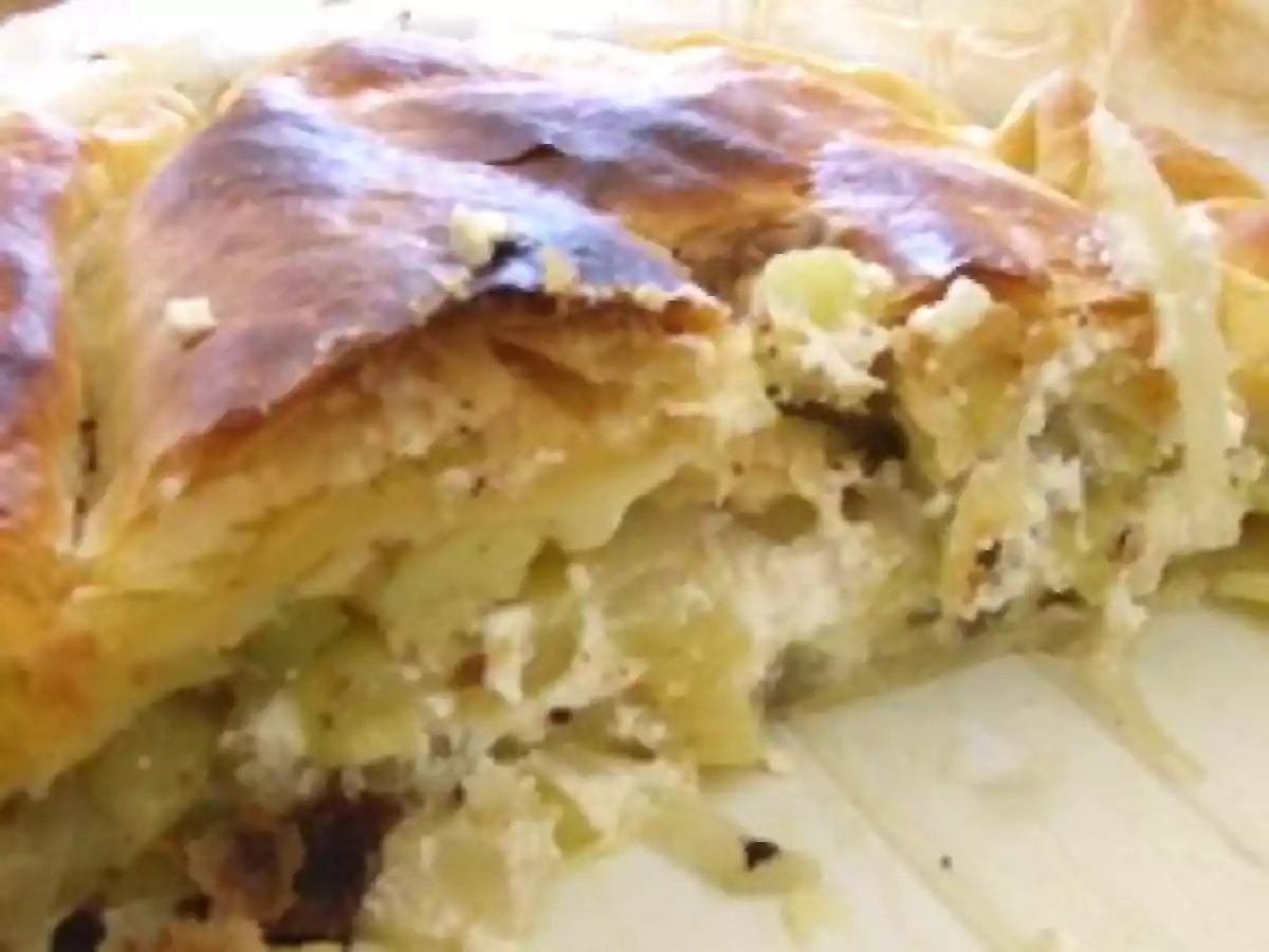 3 courgettes, 1 poivron jaune, un poivron vert et un oignon, le tout revenu dans un peu d'huile puis mélangé à quelques cuillères à soupe de Boursin Ail et Fines Herbes. - Et mis au four entre deux pâtes feuilletées jusqu'à ce que celles-ci soient bien dorées.
