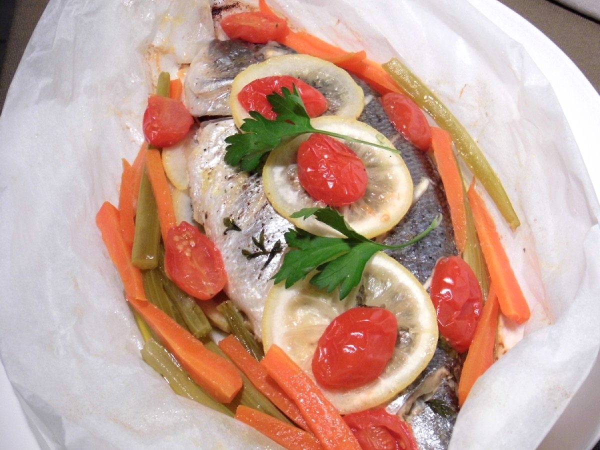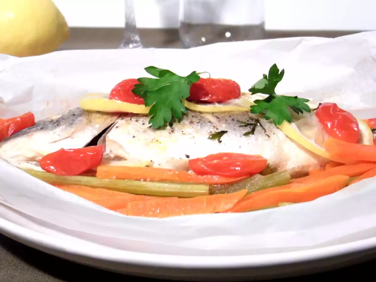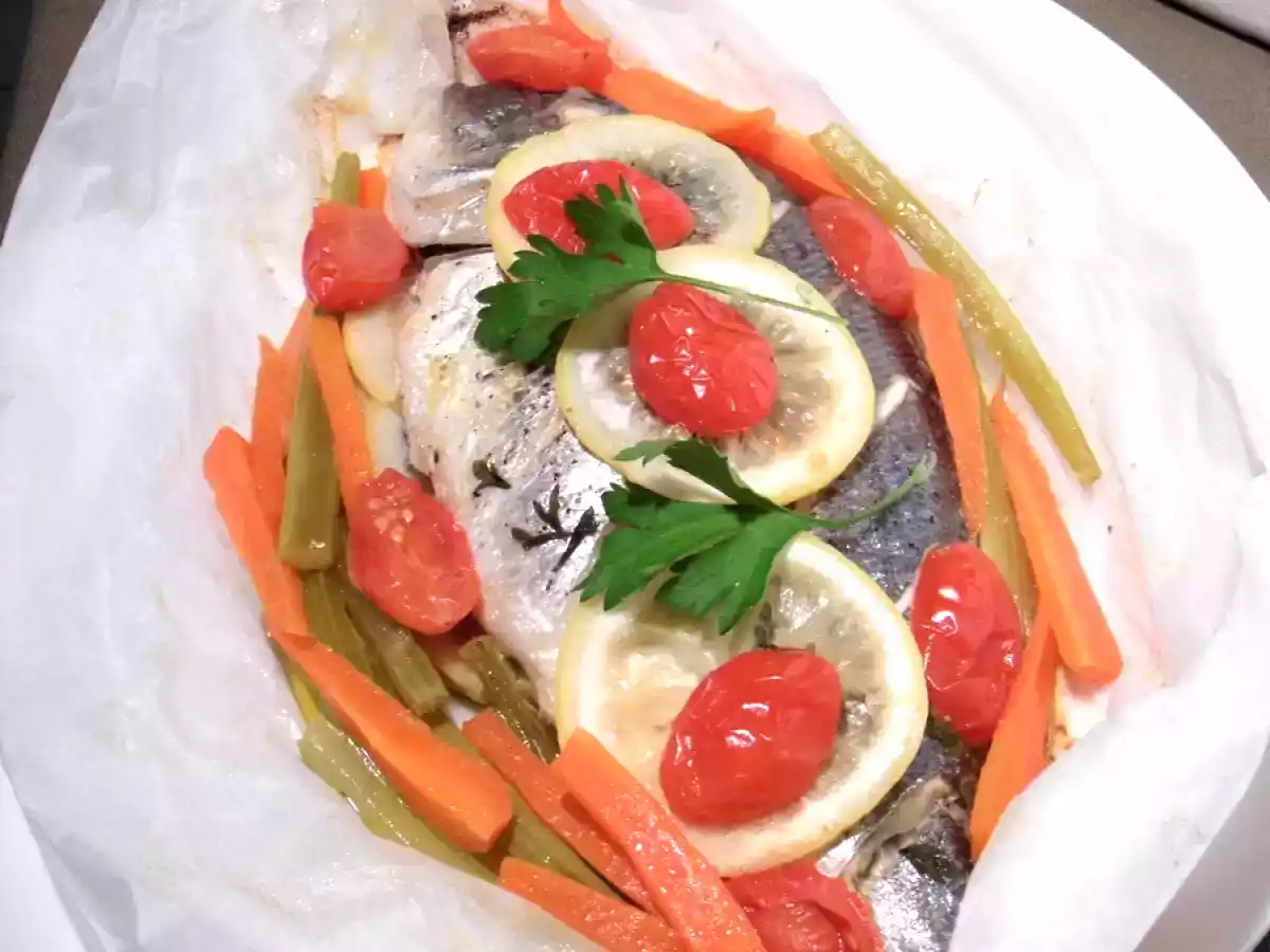 Une délicat poisson cuit en papillote tout simplement et pour plus de saveurs quelques petits légumes pour apporter une délicieuse saveur à la chair de la dorade bien moelleuse.