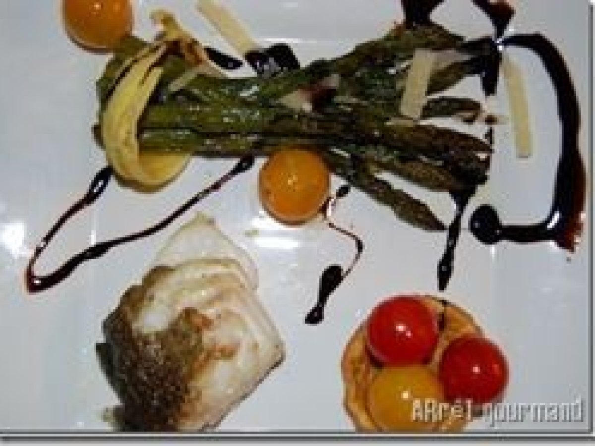 Dos de cabillaud et asperges au four Platfacile45 min Envoyer cette recette à un ami Imprimer cette page Poser une question à l'auteur Publier votre photo de cette recette Ingrédients 2 Asperges Dos de cabillauds Parmesan en morceau 2 ronds de serviettes de pâte feuilletée avec un reste de pâte réduction de balsamique pour la décoration