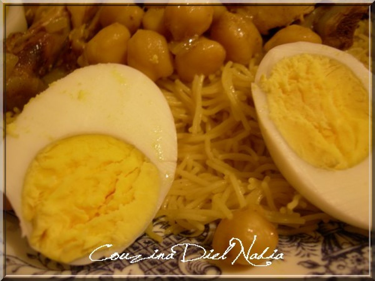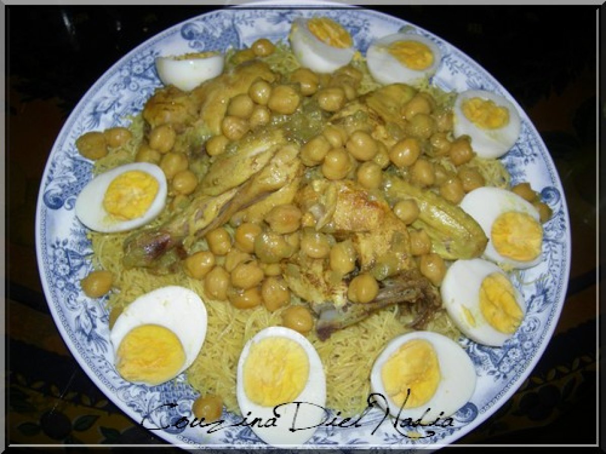 Dwida ou vermicelles au poulet PrécédentSuivant Platfacile1 h 15 m103 Kcal Envoyer cette recette à un ami Imprimer cette page Poser une question à l'auteur Publier votre photo de cette recette Ingrédients 4 Viande agneau ou poulet oignon smen ou beurre une poignée généreuse de pois chiche sel poivre cannelle curcuma (ou safran) Coût estimé: 2.01Euros€ (0.5€/part)