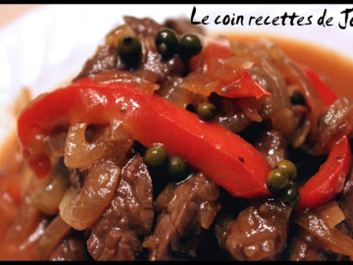 Émincé de boeuf au poivre vert votez maintenant Platfacile18 min Envoyer cette recette à un ami Imprimer cette page Poser une question à l'auteur Publier votre photo de cette recette Ingrédients 4 Sauce au poivre vert : 1 cuillère à thé de beurre 1 échalote française émincée 3 cuillères à soupe de vin rouge 1 cuillère à thé de vinaigre de vin rouge 1 ¼ tasse de sauce demi-glace 3 cuillères à soupe de poivre vert en saumure Émincé de boeuf : 1 tranche de haut de surlonge de 1 ¼ lb coupée en lanières de 2 po x ½ po ½ cuillère à thé de bicarbonate de soude 3 cuillères à soupe d'huile d'olive ½ oignon espagnol émincé 1 poivron rouge en julienne ¼ tasse de préparation crémeuse de soya pour cuisiner Sel Sauce au poivre vert