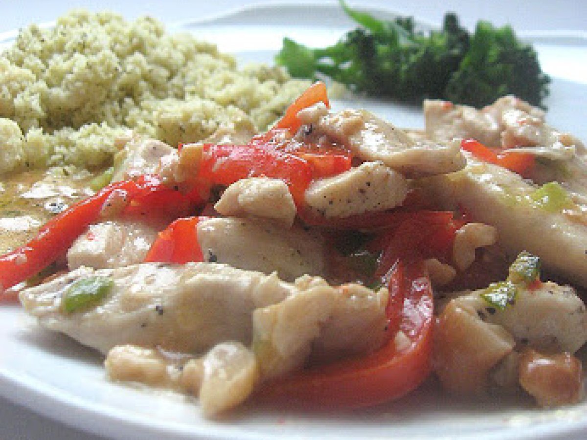 Émincé de poulet aux poivrons et aux noix d'acajou et semoule au pesto