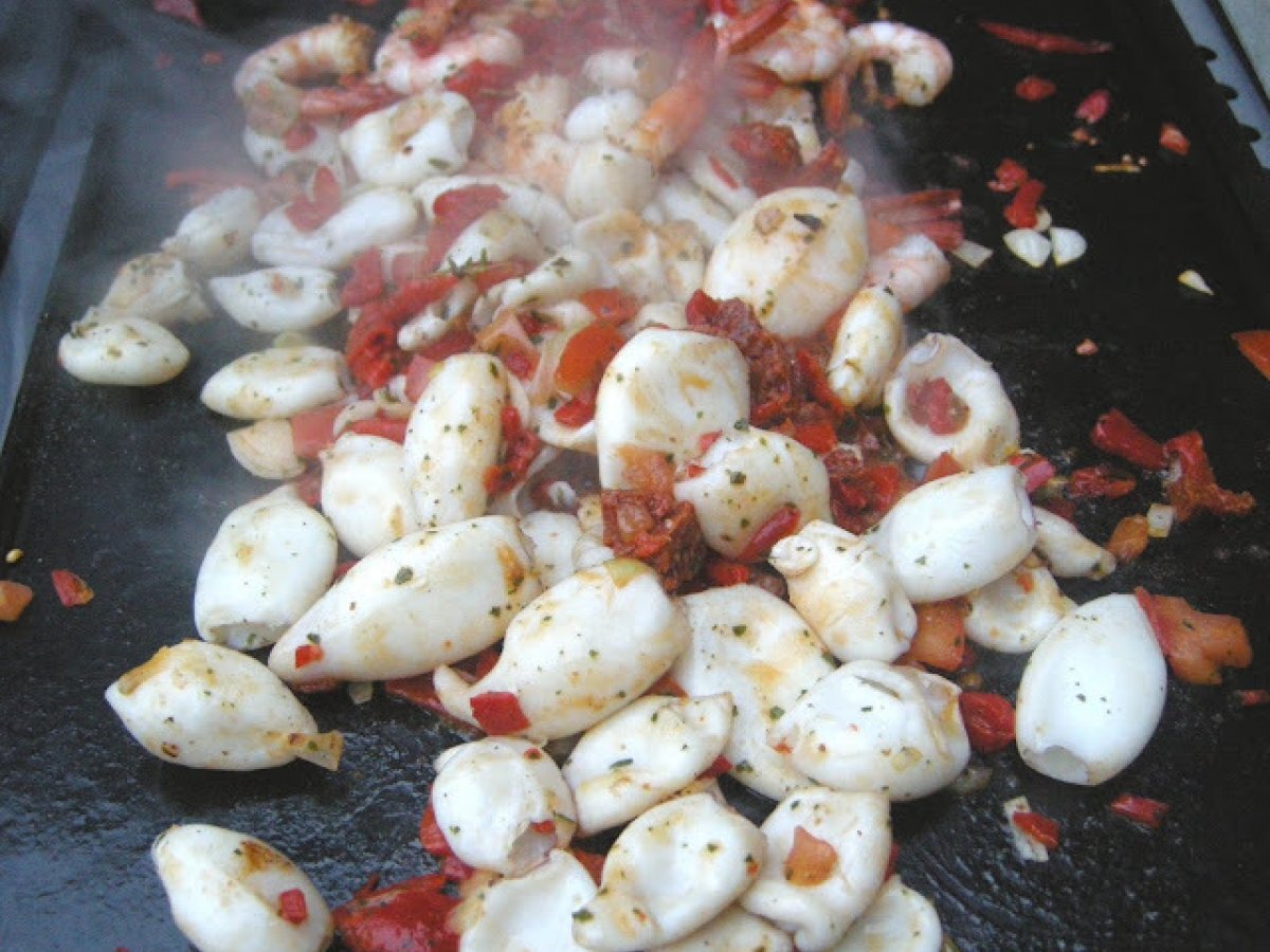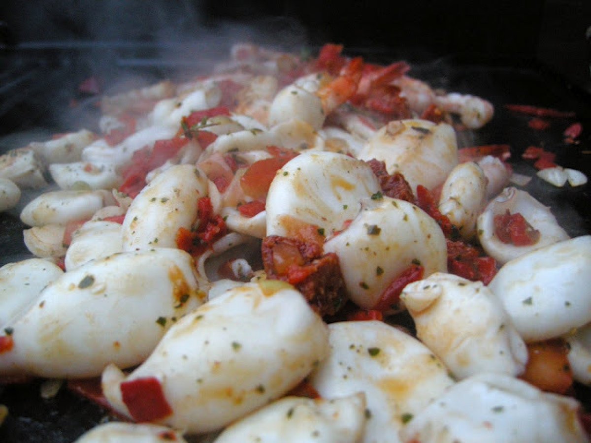 - Huiler la plancha chaude (ou la poêle anti-adhésive), jetez les encornets, les légumes, le chorizo, assaisonner.