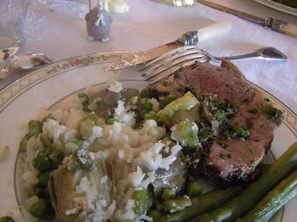 Voici une excellente épaule d'agneau roulée et farcie d'herbes fraiches accompagnée d'un risotto verdura.