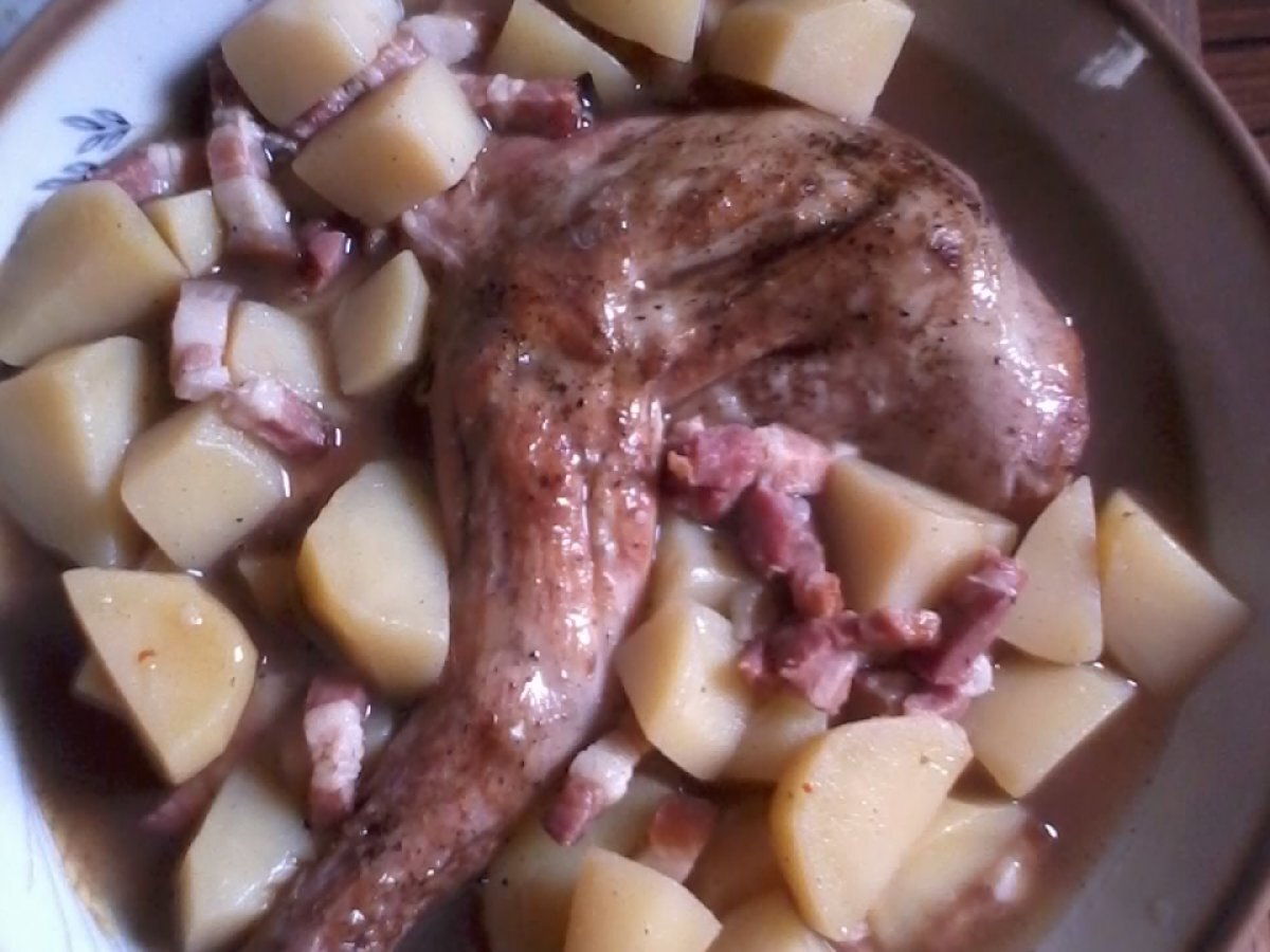 Épaule de lapin en sauce, ses lardons de poitrine fumée et ses pommes de terre