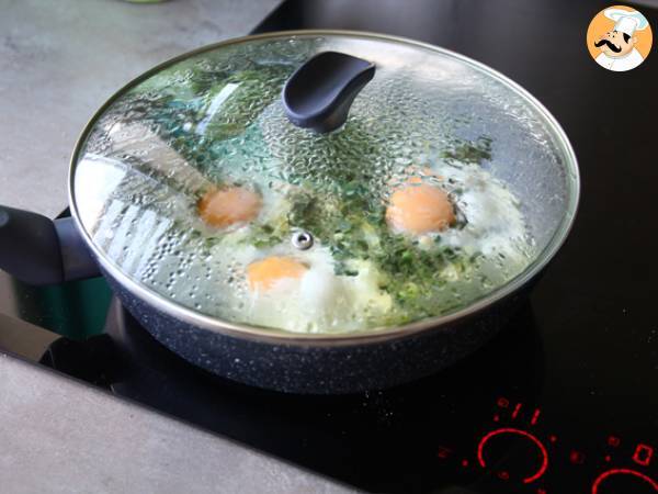 Lorsque la crème a épaissi, casser les œufs directement dessus des épinards. Couvrir et laisser cuire quelques minutes.