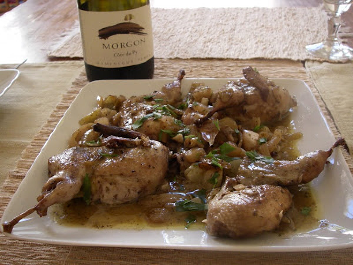 Escabèche de cailles votez maintenant Platfacile1 heure Envoyer cette recette à un ami Imprimer cette page Poser une question à l'auteur Publier votre photo de cette recette Ingrédients 2 2 belles cailles bien dodues un peu de raisins blancs bien sucrés 2 feuilles de laurier une branche de thym, quatre belles gousses d'ail 60 ml de vin blanc sec 60 ml d'huile d'olive 30 ml de vinaigre de vin 25 g de beurre 1 gros oignon grossièrement émincé de l'estragon pour servir