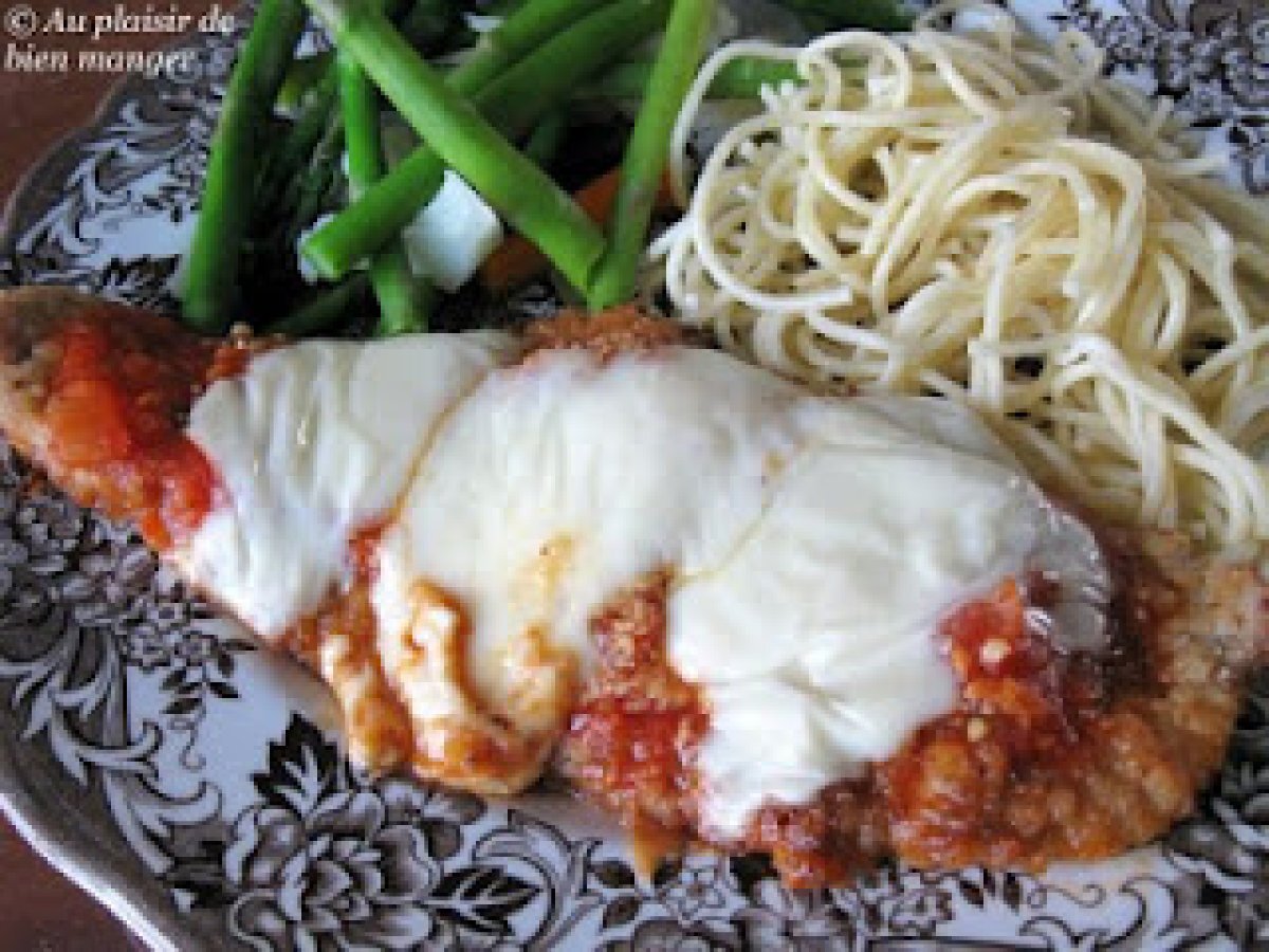 Escalopes de veau parmigiana PrécédentSuivant Platfacile30 min466 Kcal Envoyer cette recette à un ami Imprimer cette page Poser une question à l'auteur Publier votre photo de cette recette Ingrédients 4 huile pour friture 4 escalopes de veau de 4 à 5 ounces (125 à 150 g), à la température de la pièce 2 cuillère. à soupe de farine tout usage sel et poivre 1 oeuf légèrement vattu 4 cuillère.à soupe de crème 15 % 1 onces (25 g) de chapelure 8 cuillère. à soupe de parmesan râpé 1 1/4 tasse (30 c.) de sauce tomate crue 4 onces (125 g) de mozzarella tranché mince 2 cuillère. à soupe de persil haché fin 1 bouquet de cresson, pour garnir (omis) Coût estimé: 8.01Euros€ (2€/part)