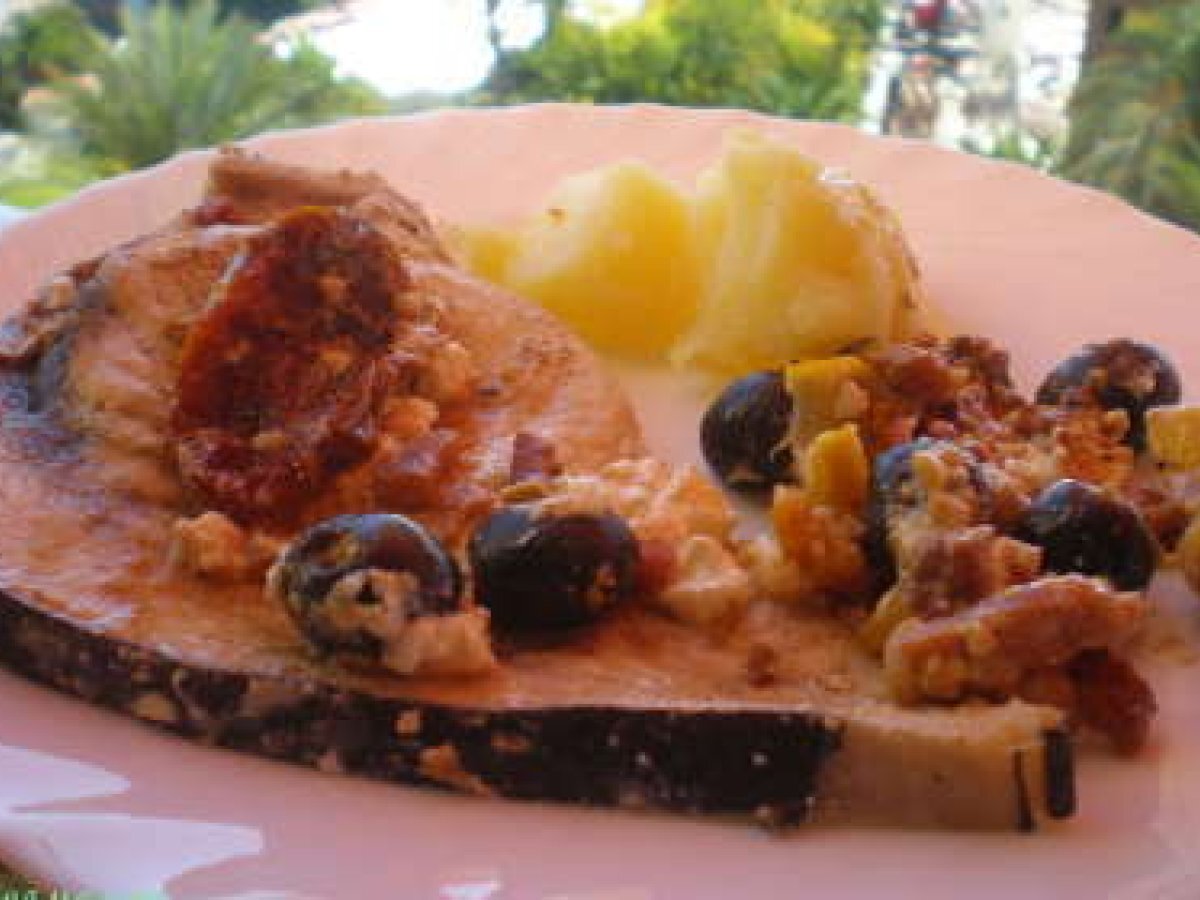 Servir en assiette le poisson accompagné de la preparacion olives-tomates-citron et arroser chacun d'un filet d'huile des tomates du bocal.