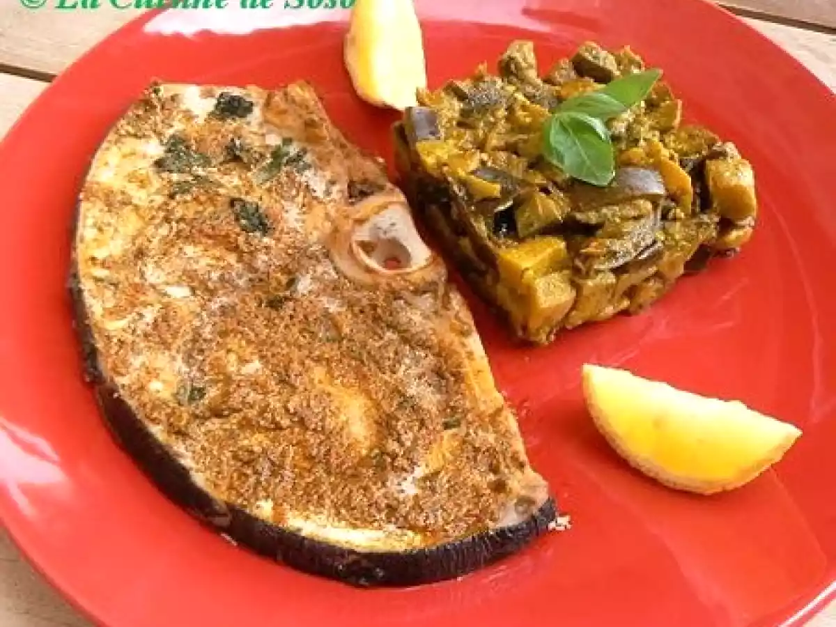 Espadon au pesto rouge , aubergines à la purée d'ail et au basilic .
