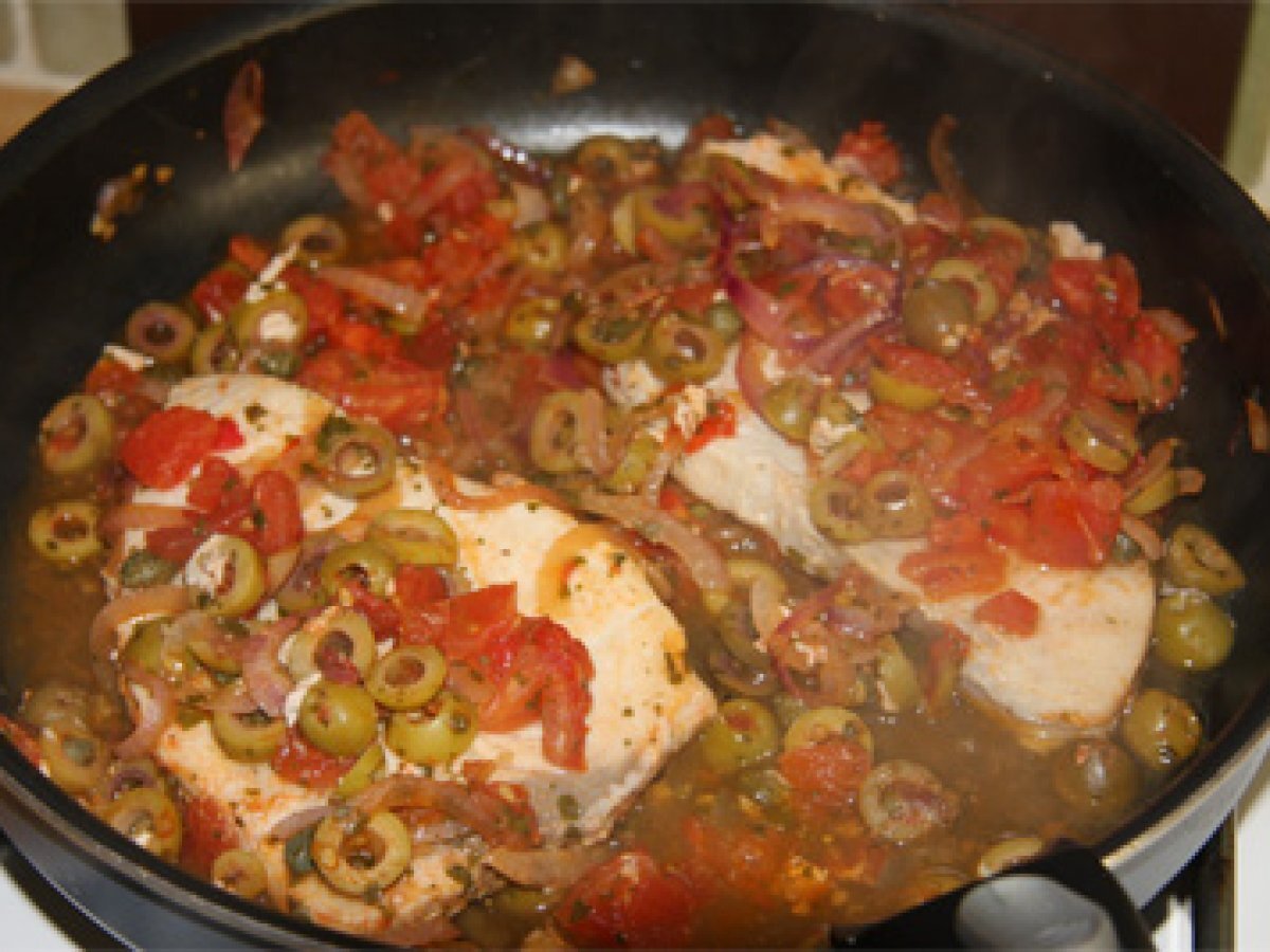 - Ajoutez les tomates coupées en dés, les olives coupées en rondelles et les câpres. Assaisonnez et laissez cuire une dizaine de minutes à feu doux.