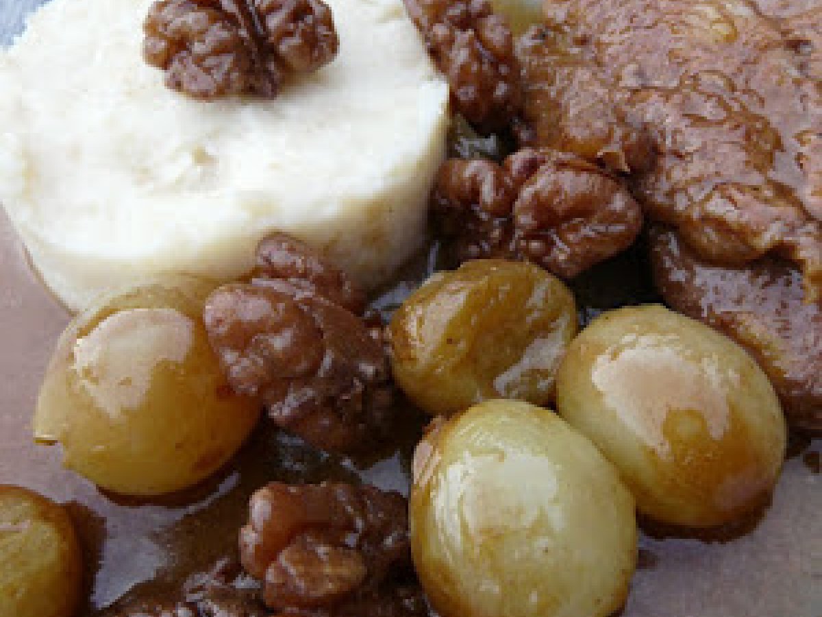 - Versez le jus de raisin et le cognac. Cuisez 30 minutes à feu doux. Ajoutez les noix .