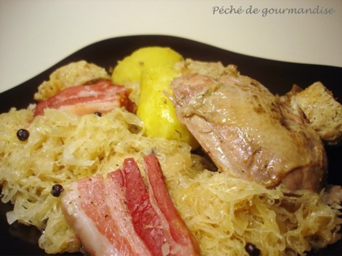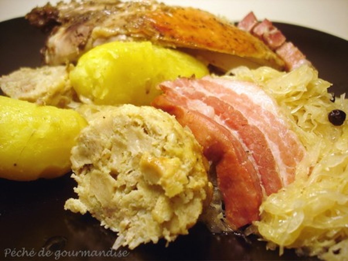 Faisan (ou pintade) à l'alsacienne PrécédentSuivant Platfacile3 h 30 m Envoyer cette recette à un ami Imprimer cette page Poser une question à l'auteur Publier votre photo de cette recette Une recette un peu long a préparé mais le résultat est exquis. Ingrédients 5 1 faisan (ou une poule faisane ou une pintade) 1 morceau de lard fumé de 300g 800 g de choucroute crue 1 boudin blanc 100 g de farce fine 1 petite pomme 2 échalotes 1 oignon 1 tranche de pain de mie 1 oeuf 10 cl de lait 2 cuillères à soupe de gin 15 cl de vin blanc d'Alsace ( j'ai mis du Riesling) 1 tablette de bouillon de volaille 1 cuillère à soupe de baies de genièvre 1 bouquet garni 50 g de beurre 1 cuillère à soupe d'huile Sel et poivre