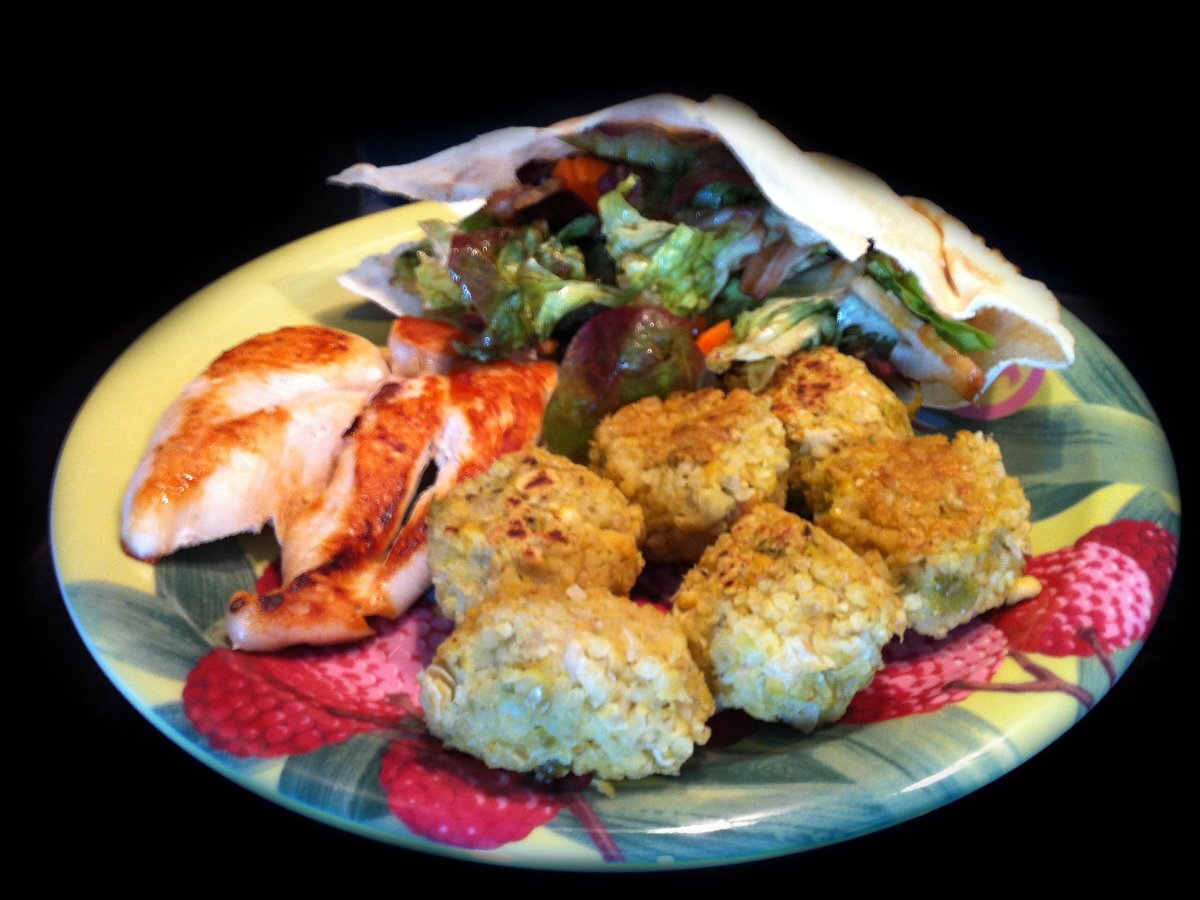 Ecraser grossièrement à la fourchette les pois chiches et les petis pois. Ajouter 1/2 cc de tahini, le cumin, saler et poivrer.