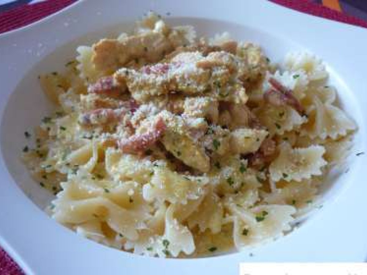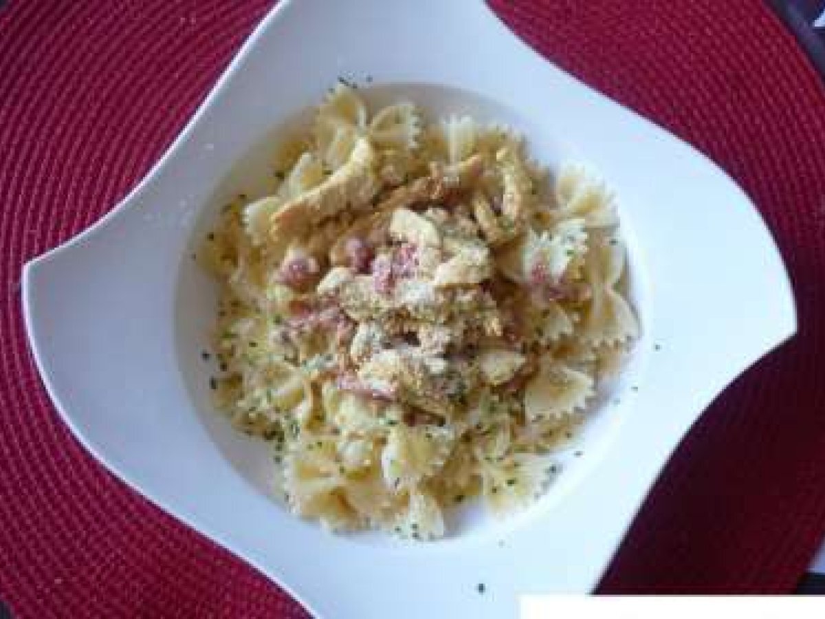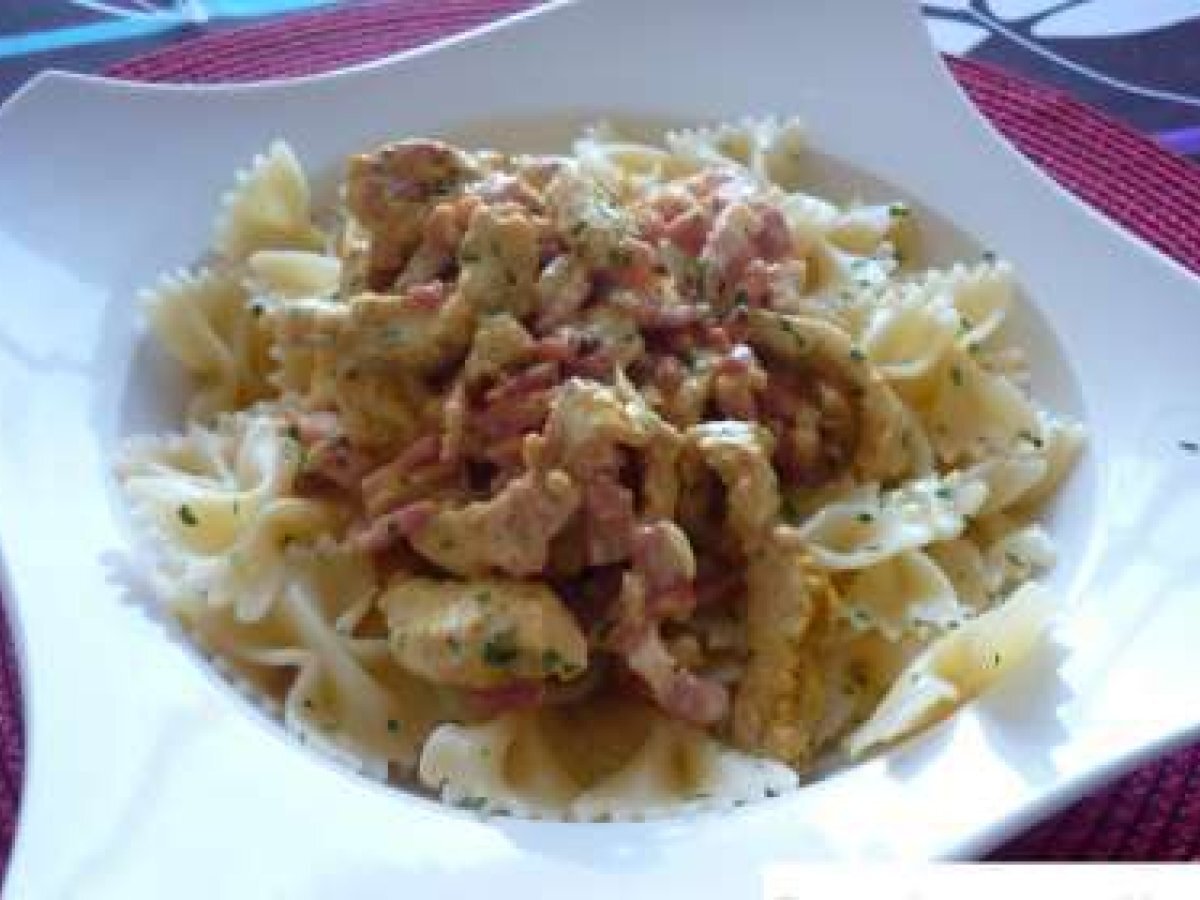 Farfalles à la dinde au curry PrécédentSuivant Platmoyen35 min Envoyer cette recette à un ami Imprimer cette page Poser une question à l'auteur Publier votre photo de cette recette Simple à réaliser, parfait à déguster ! Ingrédients 4 500g de farfalles (ou pennes, ou tout autres pâtes ) 3 escalopes de poulet ou de dinde 150g de lardons 20 cl de crème fraiche liquide Huile d'olive Curry Paprika Gruyère rapé (ou parmesan)