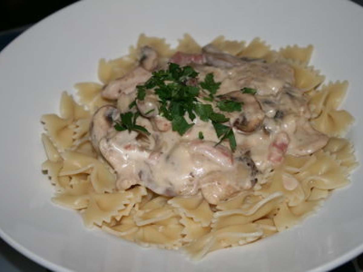 Farfalles aux champignons Platfacile35 min Envoyer cette recette à un ami Imprimer cette page Poser une question à l'auteur Publier votre photo de cette recette Ingrédients 2 un peu de beurre 1 cuillère à soupe d'huile d'olive 2 échalotes émincées 100 g de lardons 300 g de champignons 1 cuillère à café de farine 2 cuillères à soupe de crème fraîche 2 cuillères à soupe de porto 1 pincée de muscade 1 cuillère à soupe de persil plat haché 160g de farfalles