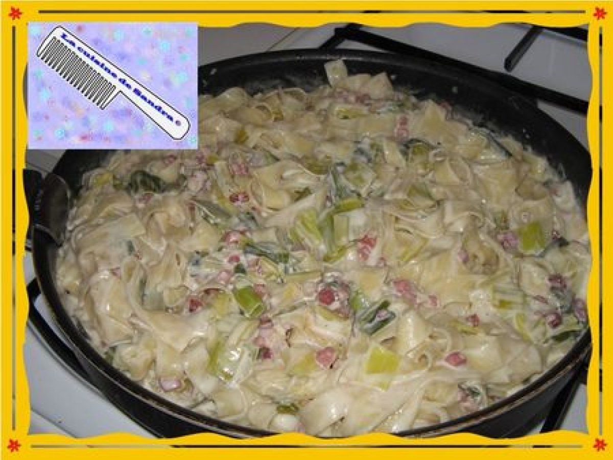 Fettuccine et sa sauce aux poireaux votez maintenant Platfacile30 min Envoyer cette recette à un ami Imprimer cette page Poser une question à l'auteur Publier votre photo de cette recette Ingrédients 4 300 à 400 g de Fettuccine (grosses tagliatelles) 2 poireaux émincés 250 g de lardons (fumés ou nature) 50 ml de vin blanc sec 1 noix de beurre 400 ml de crème liquide poivre gros sel (pour l'eau de cuisson)