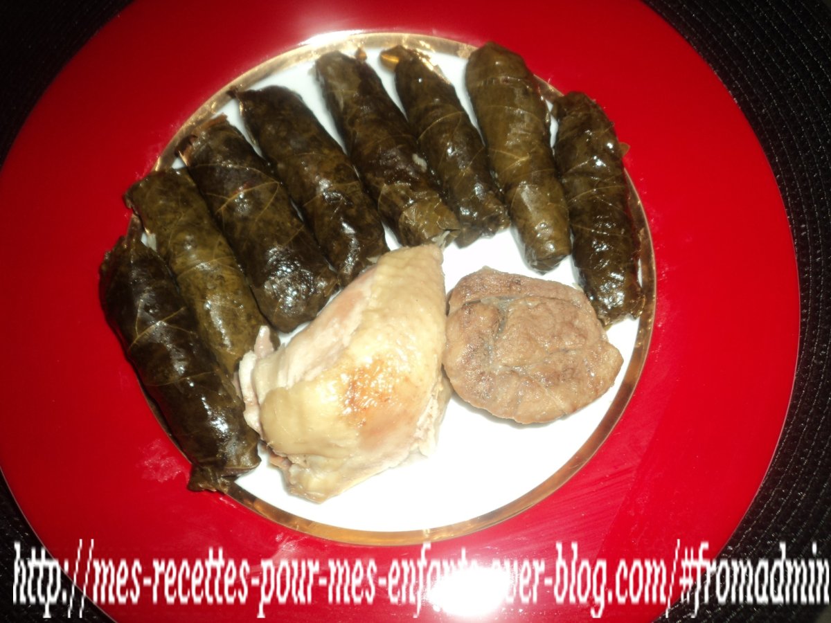 Feuilles de vigne farcies au riz et à la viande hachée Platmoyen1 journée 22 h Envoyer cette recette à un ami Imprimer cette page Poser une question à l'auteur Publier votre photo de cette recette Ingrédients 8 60 feuilles de vigne fraîches ou en bocal prêtes à l'emploi *** 500 gr viande haché - 1 tasse de riz cru 3 morceau de poulet 2 gros morceaux de viande 4 cs de persil 1 cs malhe limoun( épice oriental)*** ou 3 jus de citrons une tête d'ail *** Vous pouvez trouver des feuilles de vigne fraîches où en bocal prêtes à l'emploi chez les marchands turcs, libanais, grecs etc ....