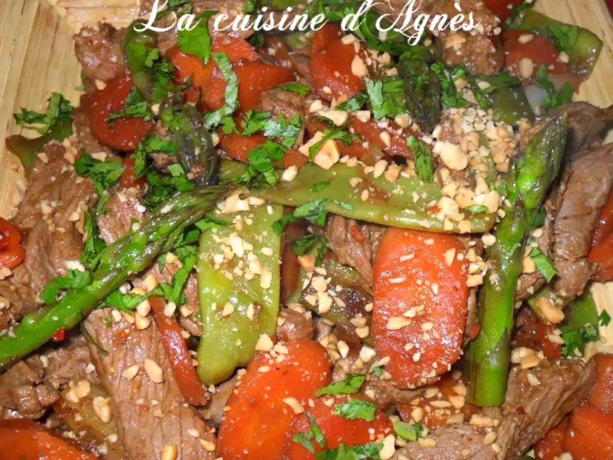 J aime bien la cuisine au wok car toute la saveur des aliments est préservée (tout comme la couleur et la texture des aliments d’ailleurs). Ici un sauté de boeuf (agneau ou porc si vous préférez)où se marie le moelleux de la viande au croquant des légumes (que vous pouvez changer en fonction des saisons aussi )…
