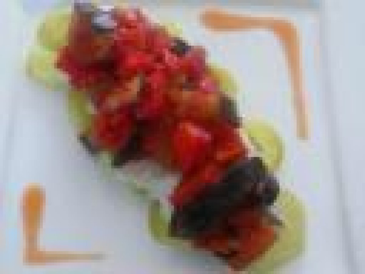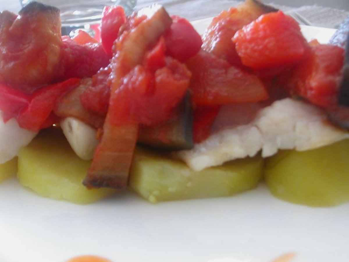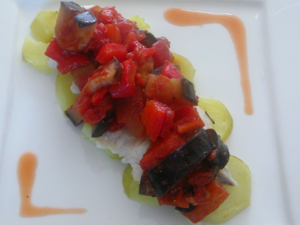 Filet de dorade et ratatouille sur un pavage de pommes de terre