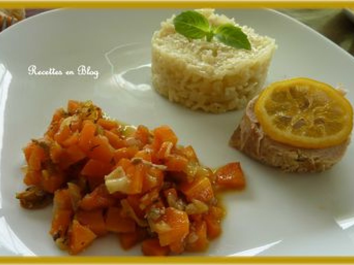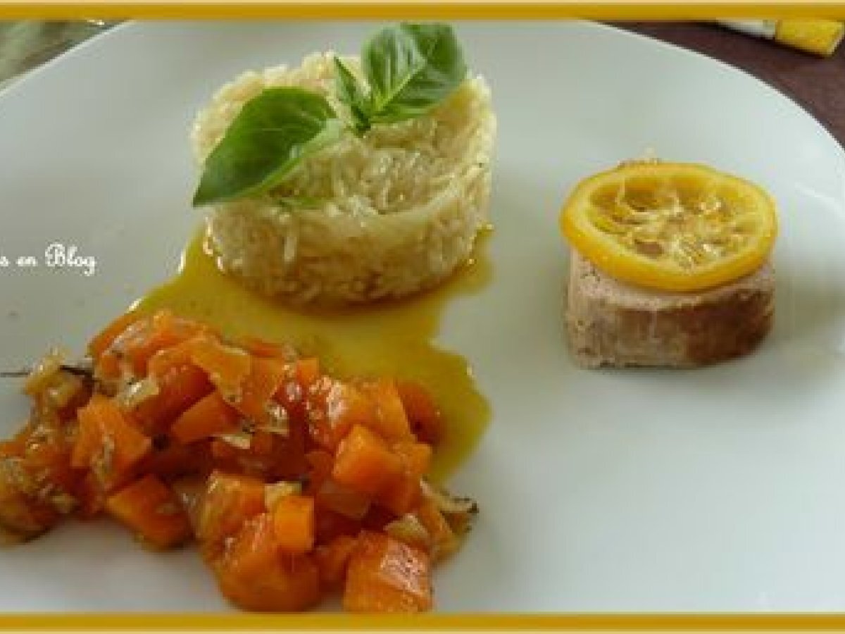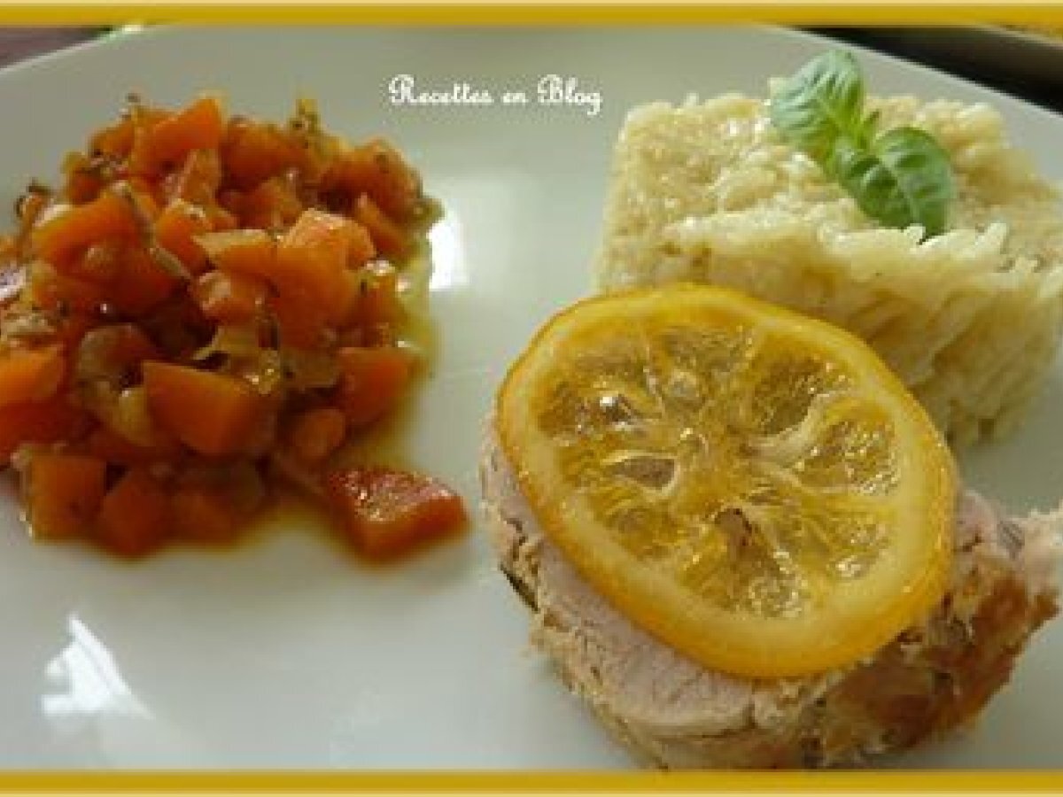 Filet de porc au citron confit et cardamome riz basmati votez maintenant PrécédentSuivant Platfacile1 h 15 m762 Kcal Envoyer cette recette à un ami Imprimer cette page Poser une question à l'auteur Publier votre photo de cette recette Ingrédients 6 Pour le filet de porc laqué au citron confit : 2 citrons 1 cuillère à café de sel 2 cuillères à soupe de miel 2 oignons 2 carottes 1 kg de filet mignon sel, poivre 60 g de beurre 1 cuillère à café de cardamome en poudre thym laurier Pour le riz basmati : 450 ml d'eau 4 cuillères à soupe de fond de volaille 2 oignons 45 g de beurre 300 g de riz basmati thym laurier sel Pour la sauce : 7,5 cl de vina blanc sec 4 cuillères à café de fond de veau déshydraté 450 ml d'eau 1,5 cuillère à soupe de coriandre ciselée