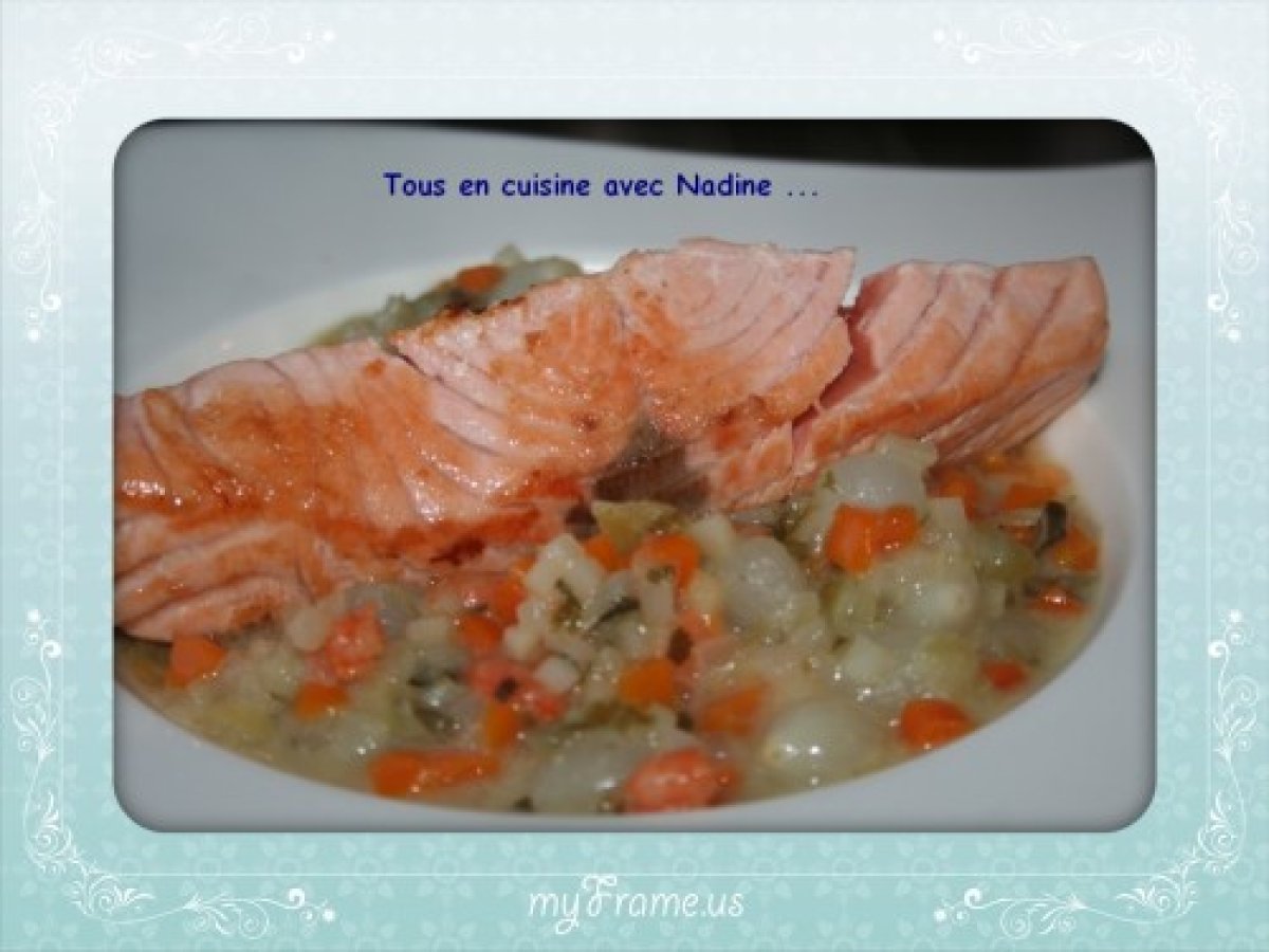 Filet de saumon aux petits légumes PrécédentSuivant Platmoyen30 min316 Kcal Envoyer cette recette à un ami Imprimer cette page Poser une question à l'auteur Publier votre photo de cette recette Ingrédients 4 4 filets de saumon 200 gr de petites crevettes roses ou grises 800 gr de petits légumes 200 gr d'oignons grelots 2 cubes de fumet de poisson dégraissé herbes ciselée le jus d'1/2 citron fécule de maïs