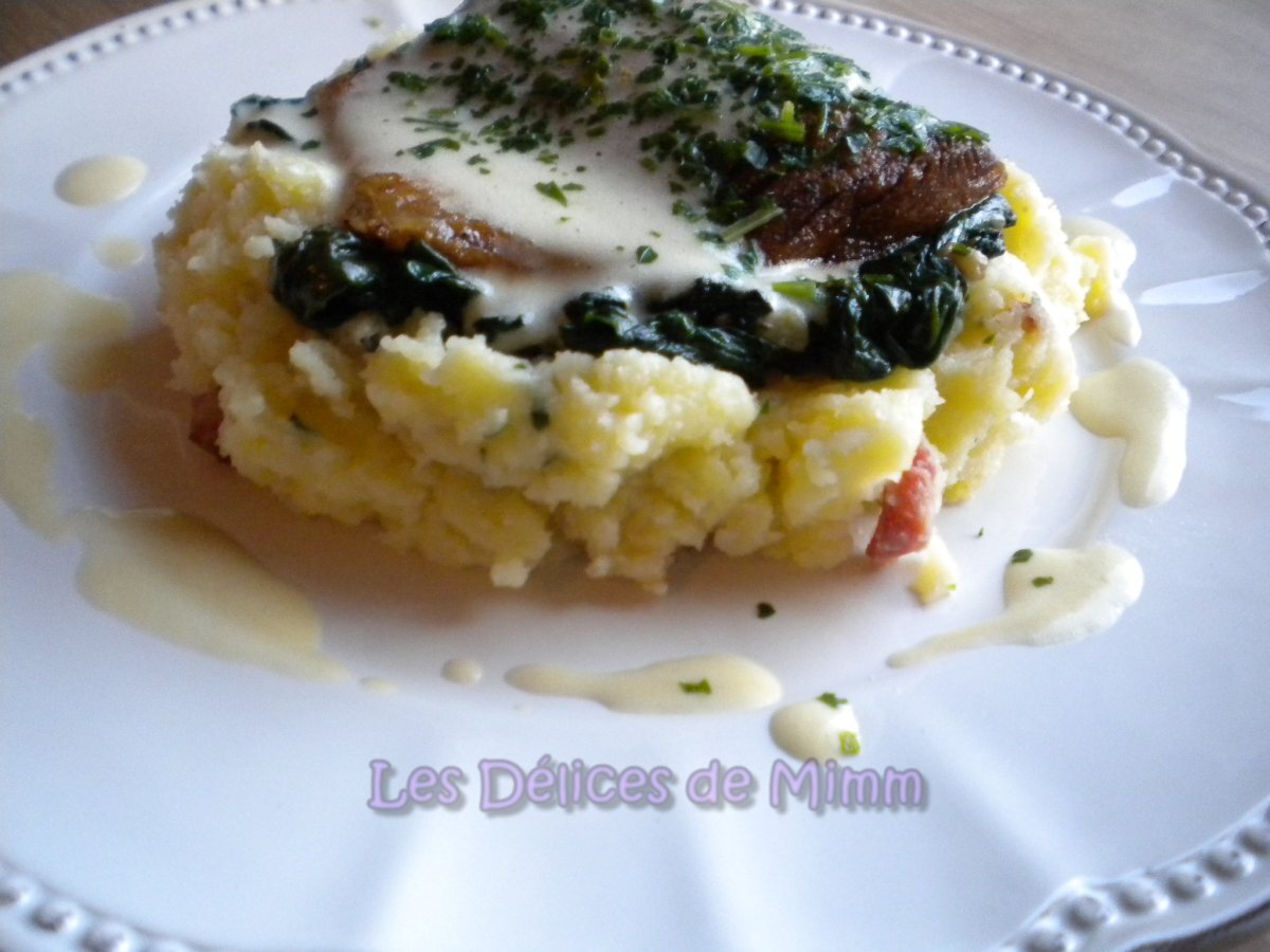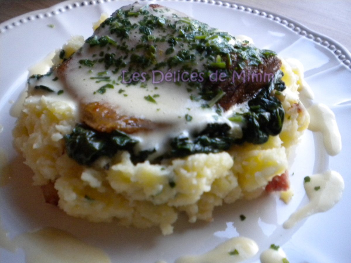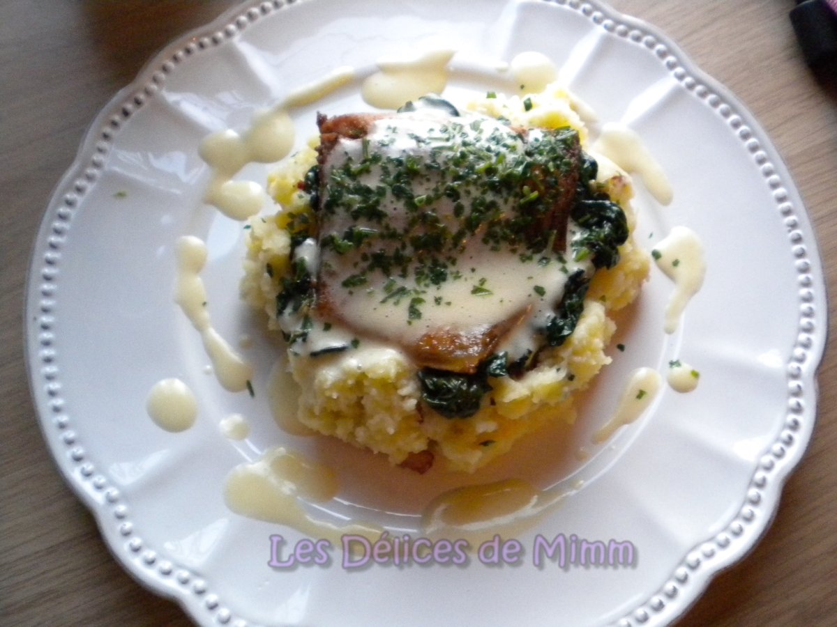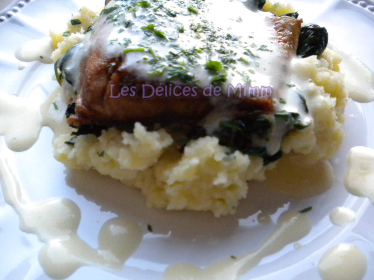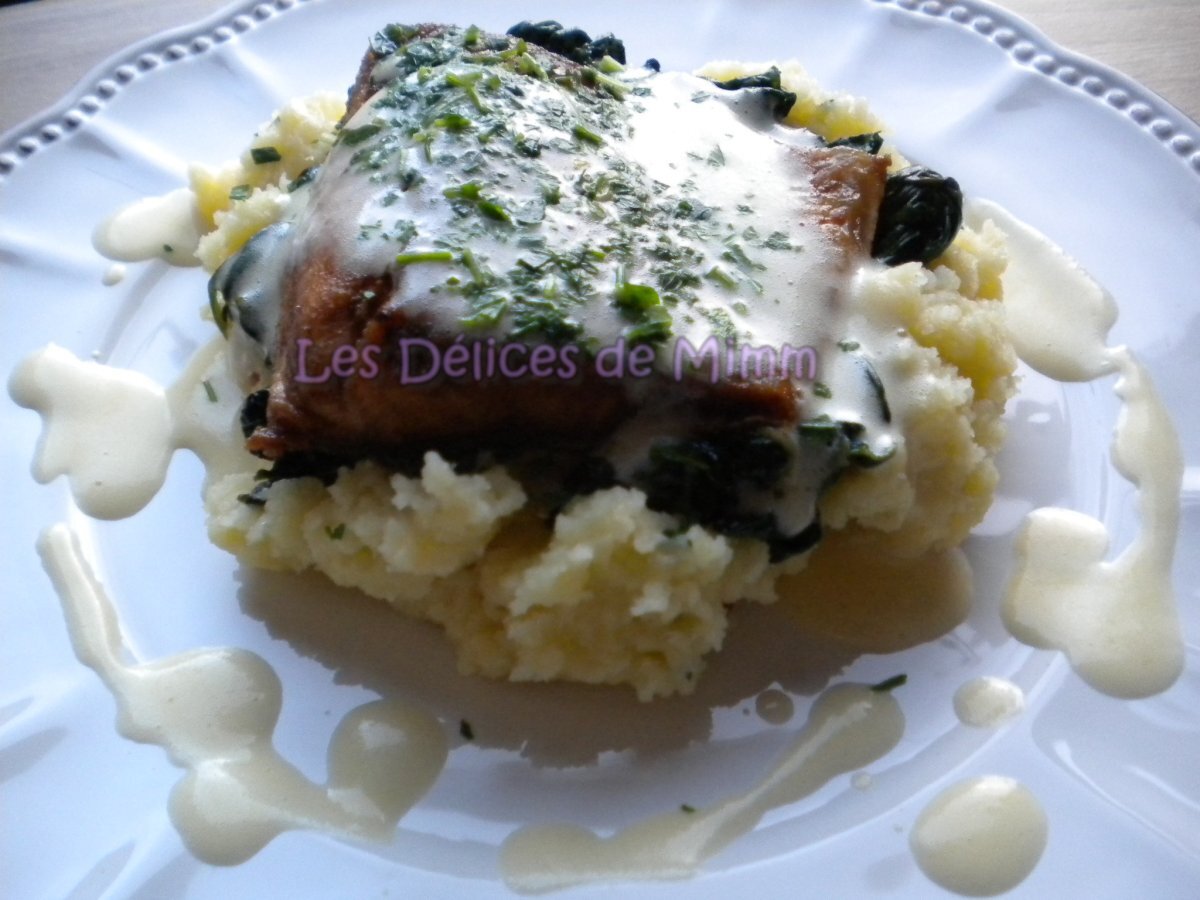 Filet de saumon, purée aux lardons, épinards et sauce sabayon