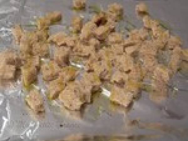 Le poisson est cuit au four ; c'est moelleux, parfumé et les croûtons apportent un peu de croquant. Servir avec des haricots fins. c'est un délice! Décorer avec la sauce aux herbes qui sent bon, bon bon. C'est à essayer absolument !
