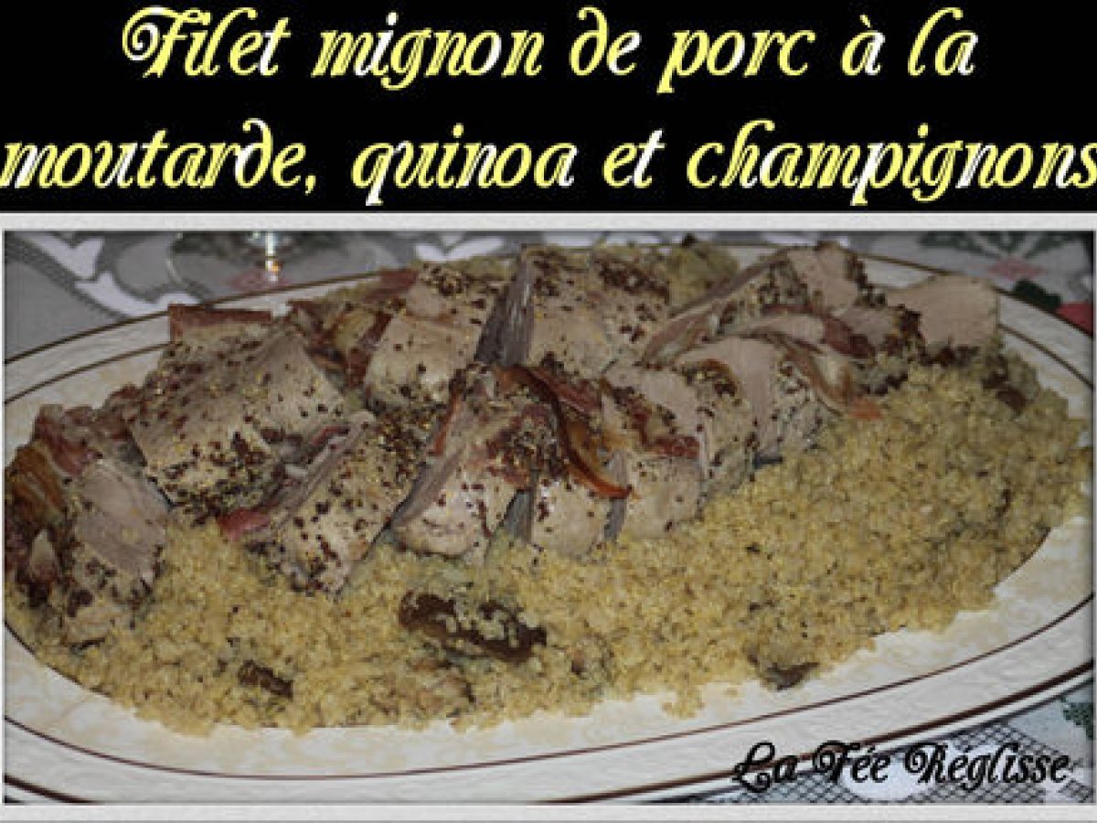 Filet mignon à la moutarde, quinoa et champignons Platfacile55 min Envoyer cette recette à un ami Imprimer cette page Poser une question à l'auteur Publier votre photo de cette recette Ingrédients 6 2 filets mignons de porc 20 tranches de copa 330g de quinoa 500g de champignons rosés 2 échalotes 30 cL de crème liquide 10 cL de vin blanc 4 cuillères à soupe de moutarde à l'ancienne 3 cuillères à soupe d'huile d'olive Sel Poivre