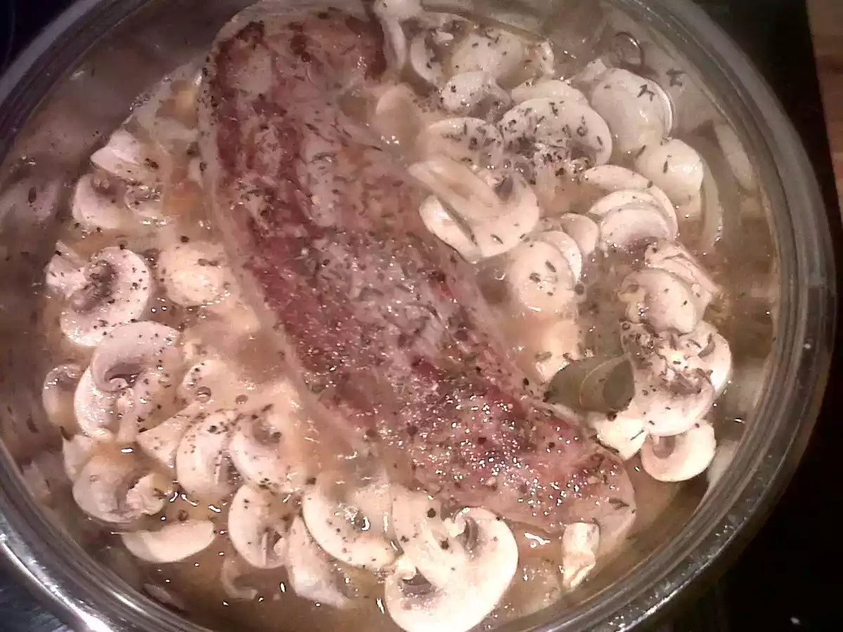 Filet mignon champignons-moutarde PrécédentSuivant Platmoyen55 min Envoyer cette recette à un ami Imprimer cette page Poser une question à l'auteur Publier votre photo de cette recette Ingrédients 4 1 filet mignon 1 oignon 1 verre de vin blanc sec 15 cl d'eau 2 cuillères à café de fond de veau 1 cuillère à café de maïzena 2 cuillères à soupe de crème fraîche épaisse 8 petits champignons de Paris frais ou une boîte de champignons de Paris 3 cuillères à soupe de moutarde Une noix de beurre Sel, poivre, thym, romarin et laurier