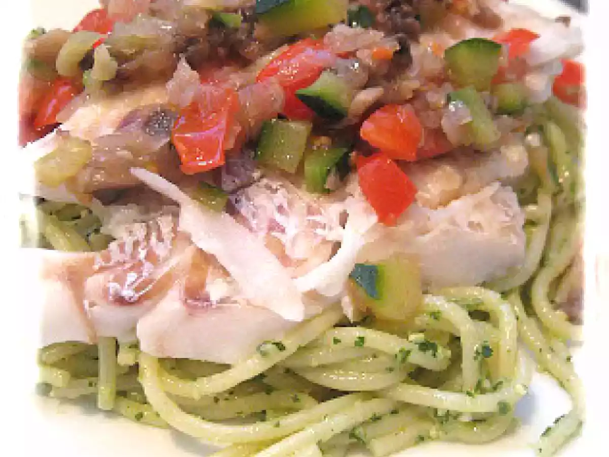 Filets d'aiglefin à la poêlée de légumes, linguines au pesto à la coriandre Platfacile30 min Envoyer cette recette à un ami Imprimer cette page Poser une question à l'auteur Publier votre photo de cette recette Ingrédients 4 Filets d'aiglefin à la poêlée de légumes : 4 filets d'aiglefin de 180 g ( 6 oz) chacun 1/2 tasse (125 ml) de farine 3 cuillères à soupe (45 ml) de beurre 4 cuillères à soupe (60 ml) d'huile d'olive 1 tasse (250 ml) de courgettes coupées en dés 1 tasse (250 ml) d'oignon rouge coupé en dés 2 tasses (500 ml) de champignons coupés en dés 2 gousses d'ail hachées 1 tomate coupée en dés Sel et poivre, au goût Linguines au pesto à la coriandre : 1/3 tasse (80 ml) de graines de citrouille (moi pignons) 5 gousses d'ail 4 tasses (1 L) de coriandre fraîche 1/2 tasse (125 ml) d'huile d'olive extra-vierge 6 cuillères à soupe (90 ml) de parmesan râpé Poivre, au goût 1 paquet de 500 g( 1 lb) de linguines Sel, au goût