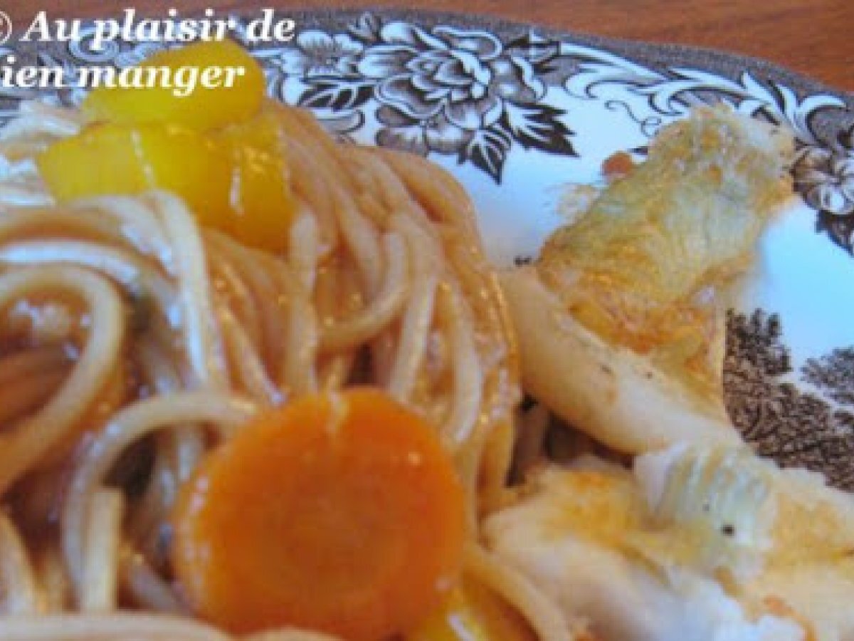 Filets de poisson à l'aigre-doux sur lit de nouilles aux légumes votez maintenant Platmoyen30 min Envoyer cette recette à un ami Imprimer cette page Poser une question à l'auteur Publier votre photo de cette recette Ingrédients 1 1/2 paquet de nouilles de riz larges 1 tasse de bouillon de poulet 1/4 tasse de jus d'orange 3 cuillères à table de sucre 2 cuillères à table de vinaigre de vin rouge 2 cuillères à table de pâte de tomates 2 cuillères à thé de fécule de maïs 2 cuillères à thé de sauce soja 1 cuillère à thé de gingembre moulu 2 gousses d'ail hachées finement 2 cuillères à table d'huile végétale 4 filets de poisson blanc 1 poivron rouge coupé en dés 2 tasses de champignons frais, coupés en quatre 1 courgette coupée en dés