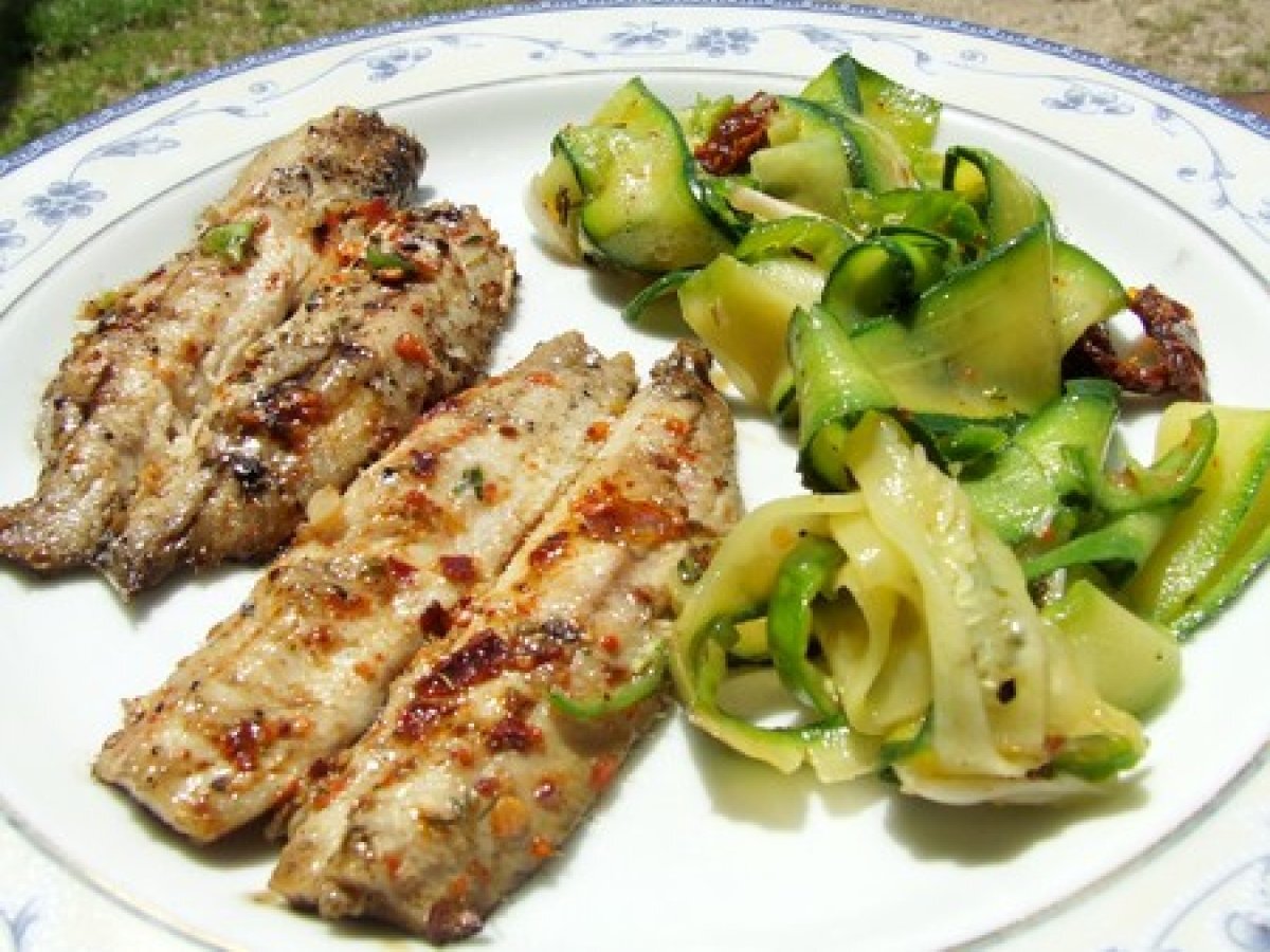Filets de sardines marinés au bbq, tagliatelles de courgettes