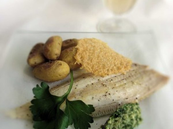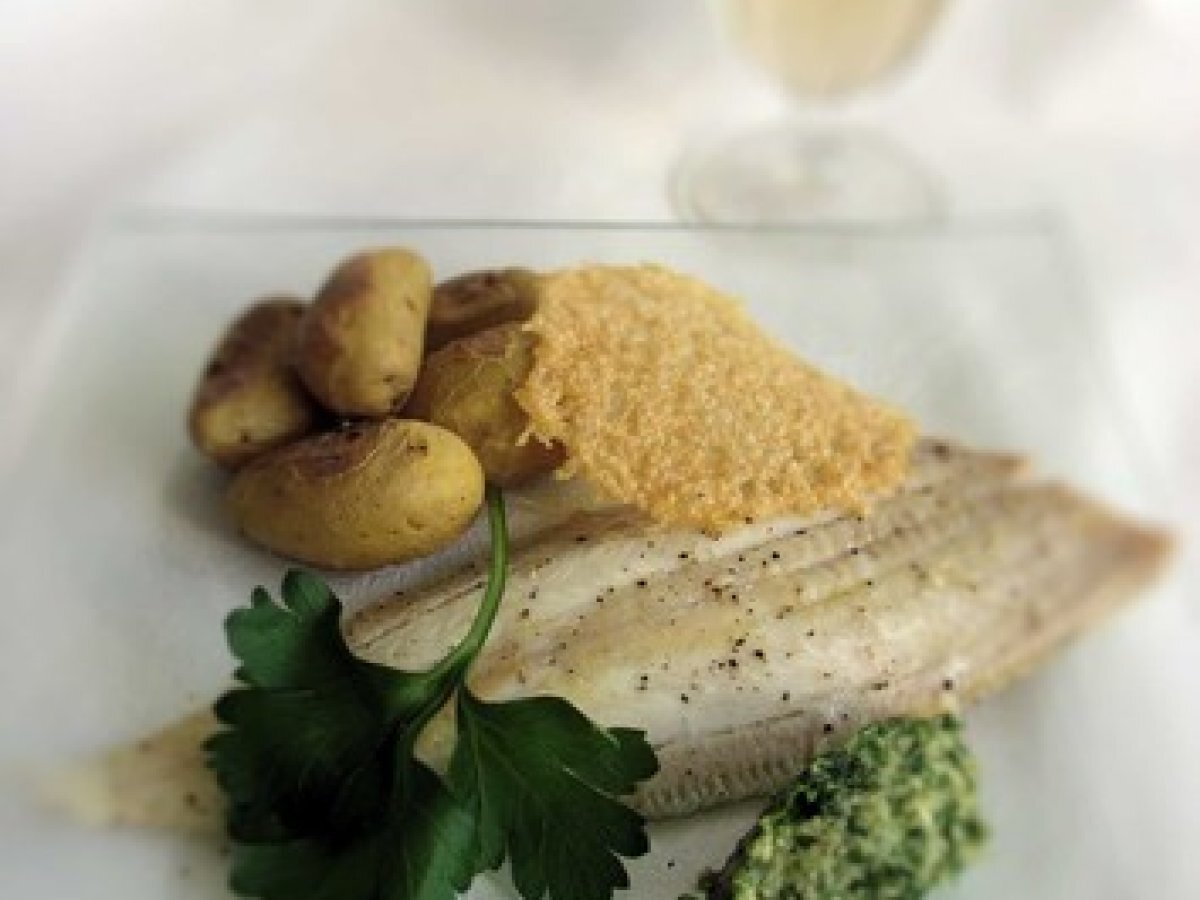 Filets de sole au pesto de coriandre, dentelles de parmesan