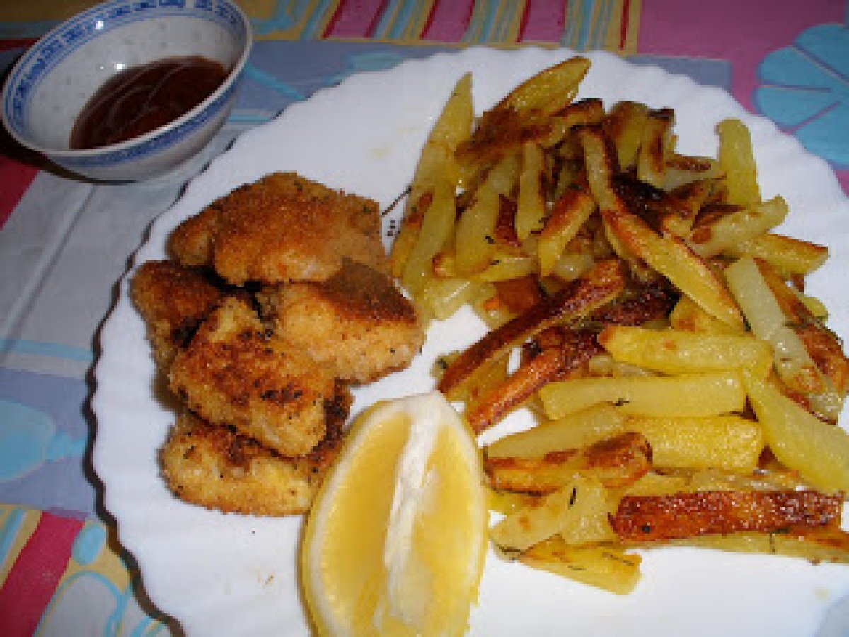 Fish and chips d'après gordon ramsay et sa cuisine rapide Platfacile40 min658 Kcal Envoyer cette recette à un ami Imprimer cette page Poser une question à l'auteur Publier votre photo de cette recette Ingrédients 4 500 g de poisson blanc (nous avons pris du Julienne) 75 g de farine (il y en avait de reste) 2 oeufs 75 g de chapelure huile d'olive 1 citron coupé en quartier sel poivre 1 kg de pommes de terre 3 grosses gousses d'ail non pelées du thym du romarin Coût estimé: 7.6Euros€ (1.9€/part)